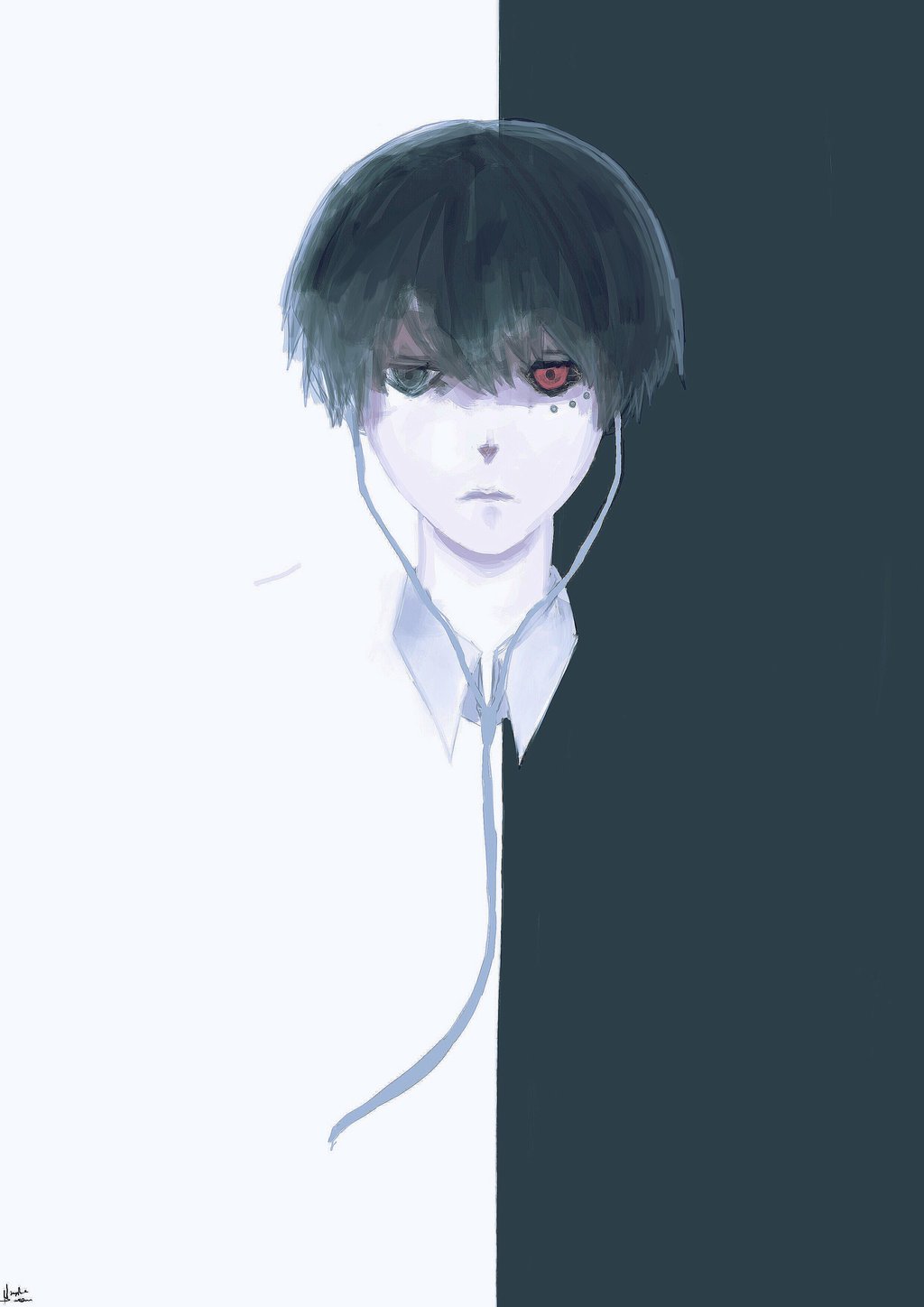 Description: A man with a tie and a white shirt with red eyes is standing in front of a black and white wall.