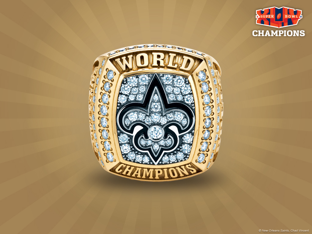 Description: A new orleans saints ring with the words world champs on it and a gold background with a brown background.