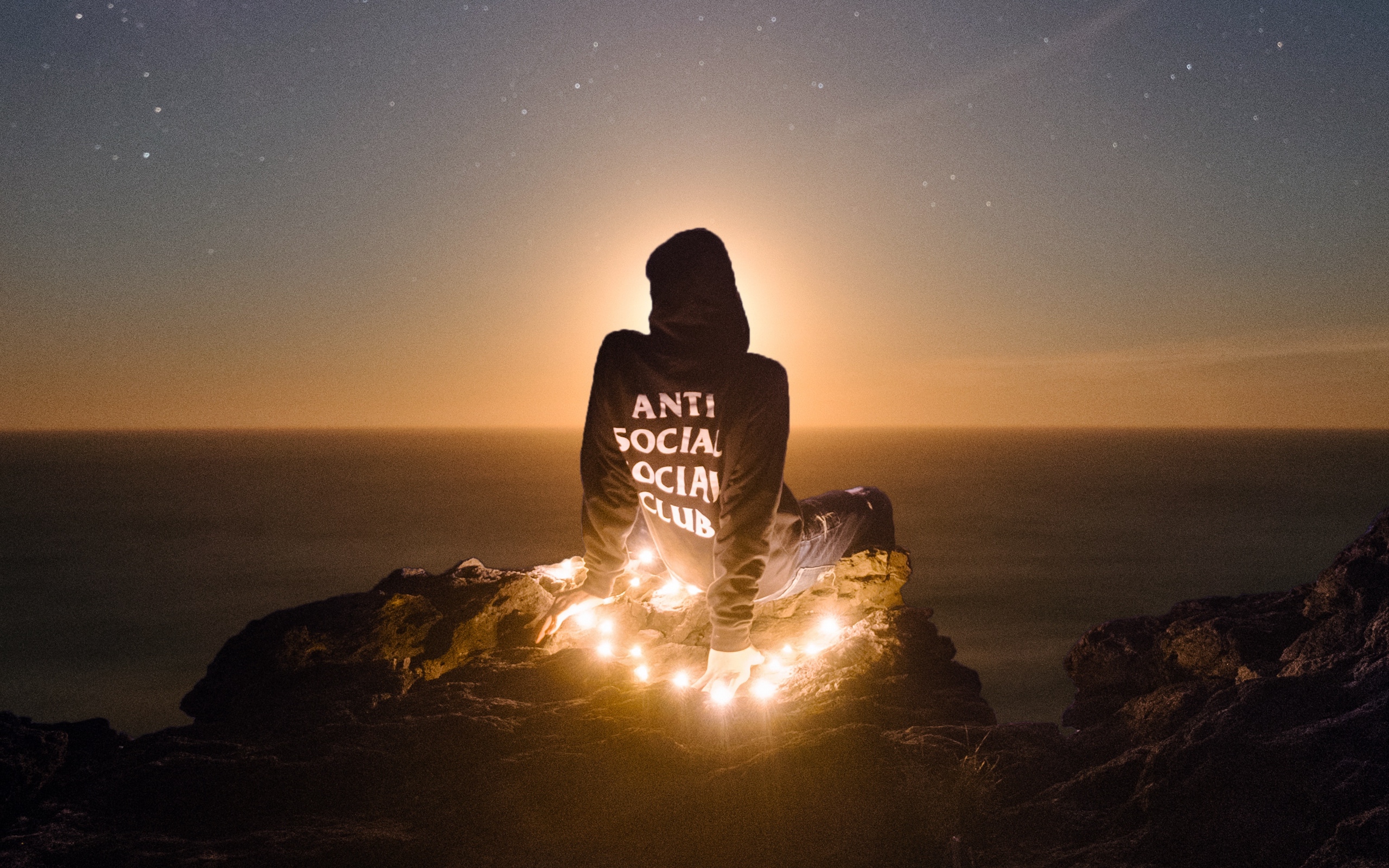 Description: A person sitting on a rock with a sign on it that says anti social social media on it at night.