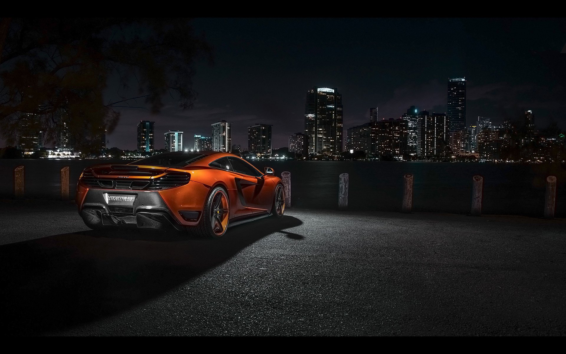 Description: A very nice looking car in the dark by the water at night time with a city in the background.