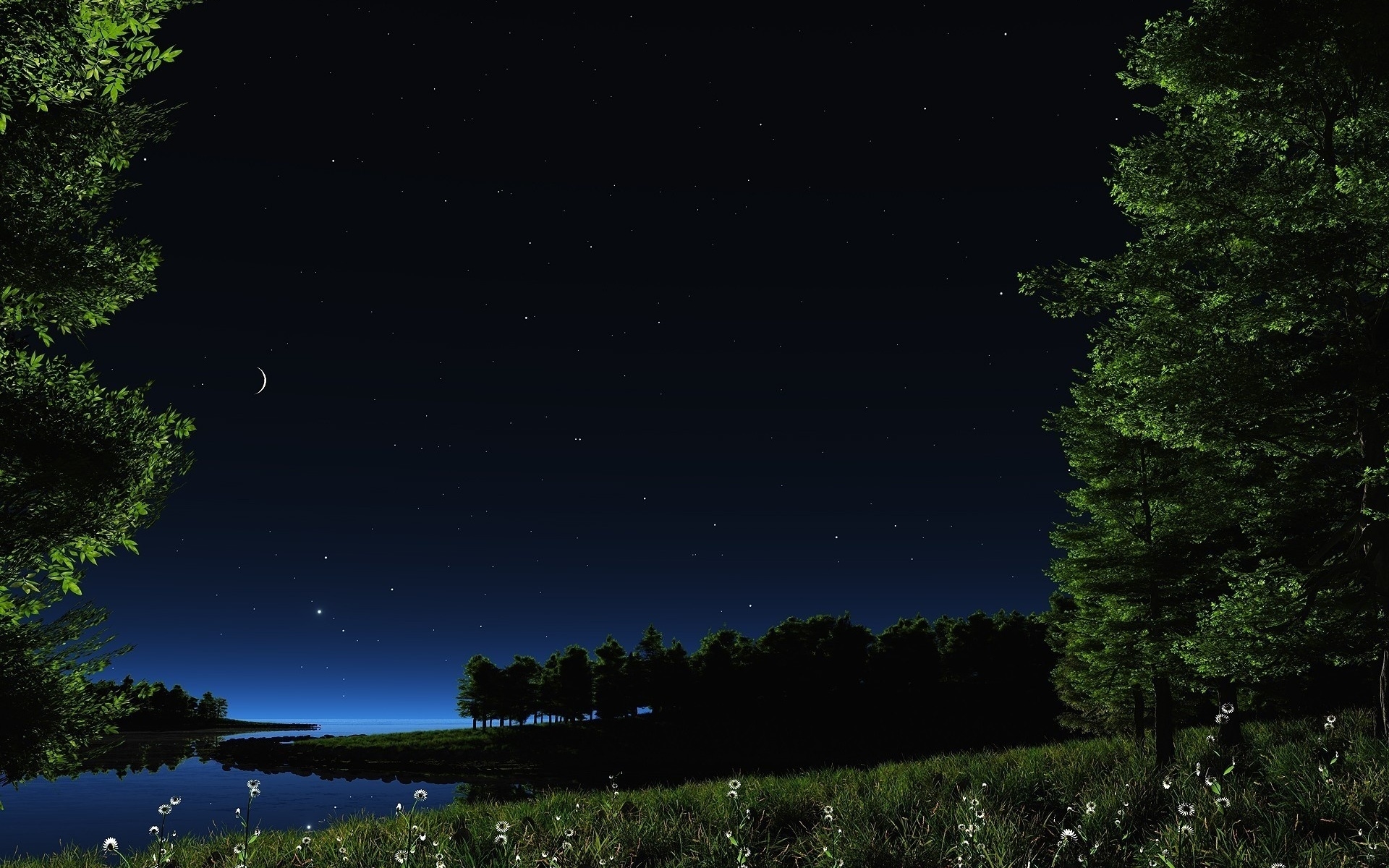 Description: A night scene with a lake and trees in the foreground and a moon in the sky above it.