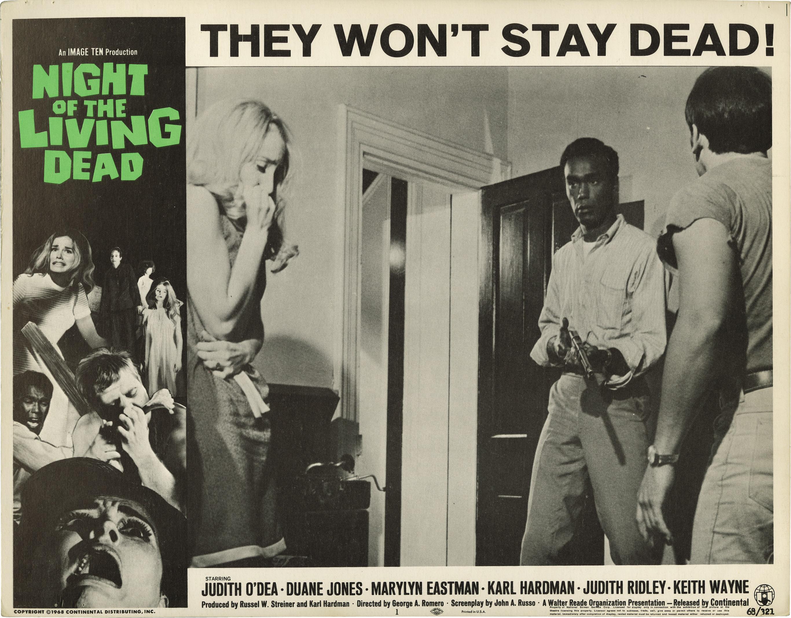 Description: A poster for the movie night of the living dead with a woman in a dress and a man in a tie.