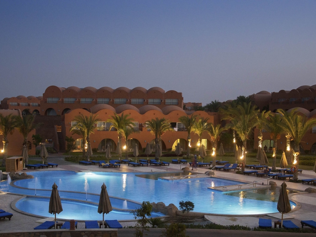 Description: A large swimming pool surrounded by lawn chairs and palm trees at night time with lights on the poolside.