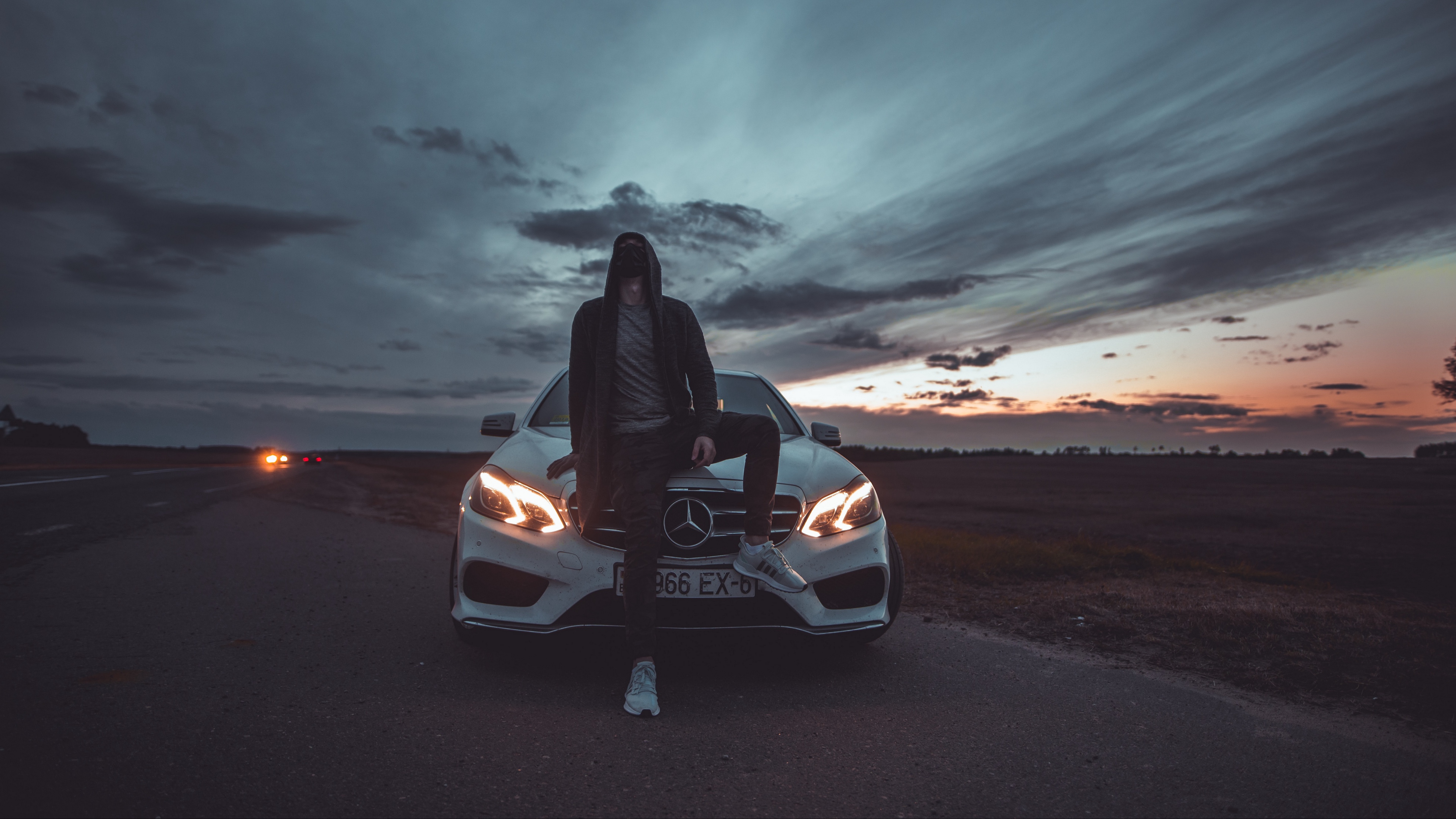 Description: A person sitting on the hood of a car on a road at night with a cloudy sky in the background.