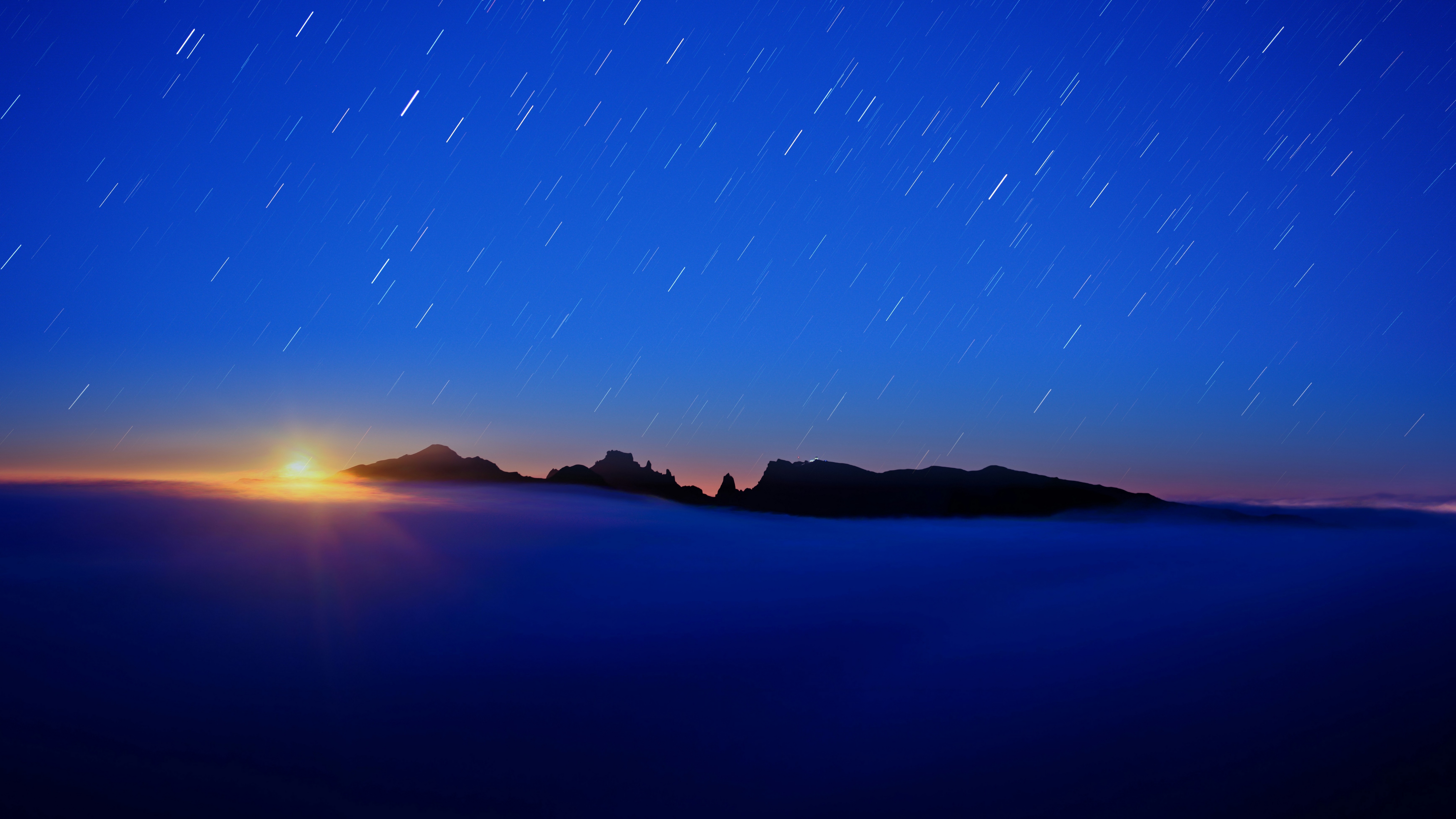 Description: A night sky with stars and a mountain in the distance with a bright sun in the distance and a few clouds.
