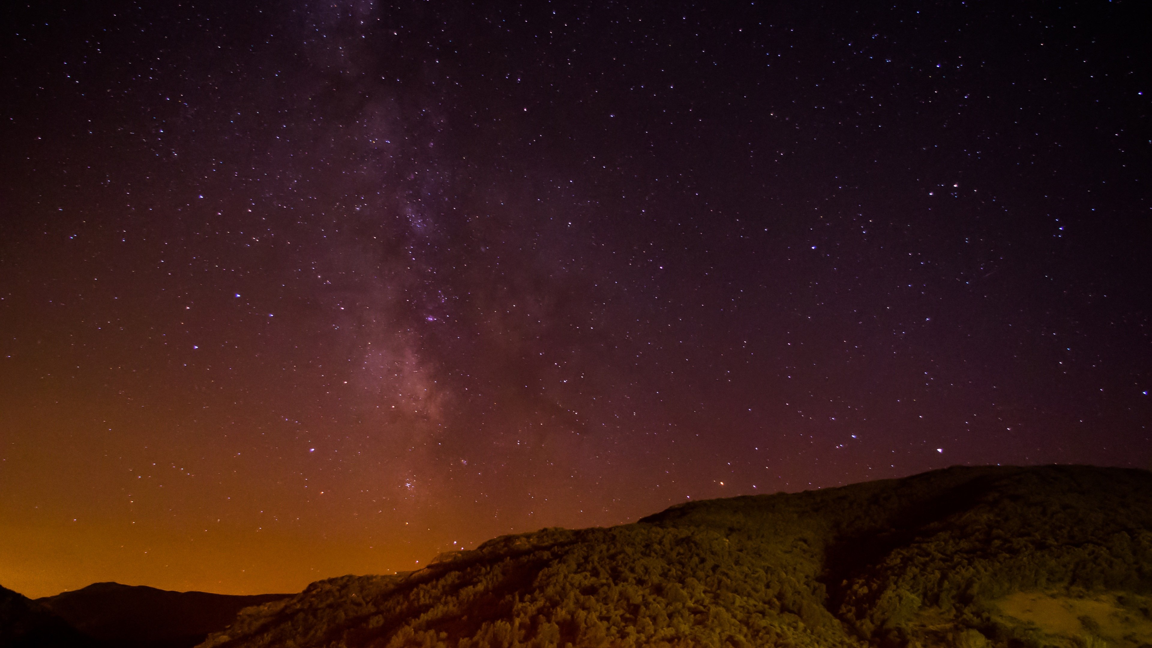 Description: A night sky with stars and a mountain under it with a bright orange glow on the ground and a bright orange glow on the ground.
