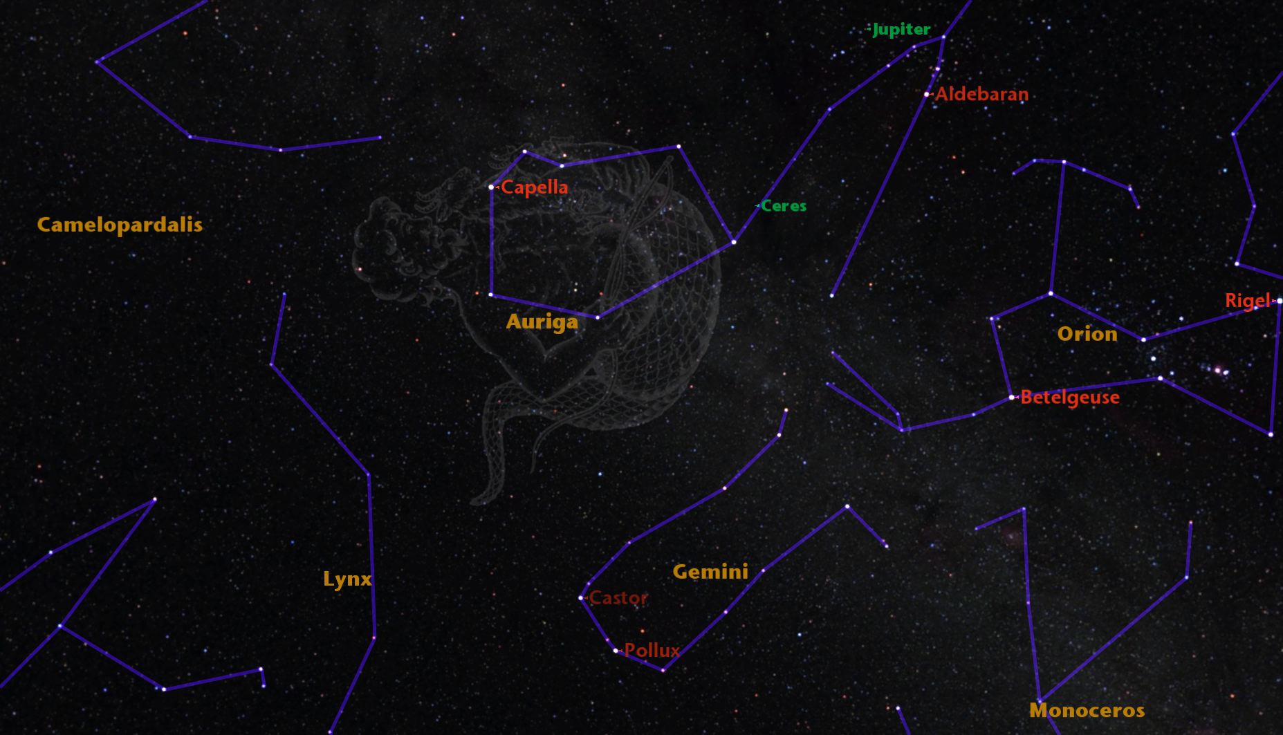 Description: A night sky with many stars and a line of lines in the sky with the names of the stars.