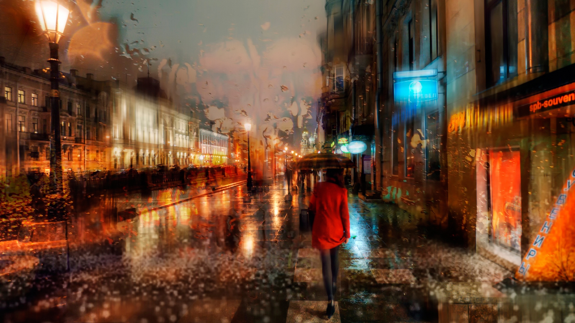 Description: A person walking down a street at night with an umbrella on the side of the street and a building with a neon light on the side.