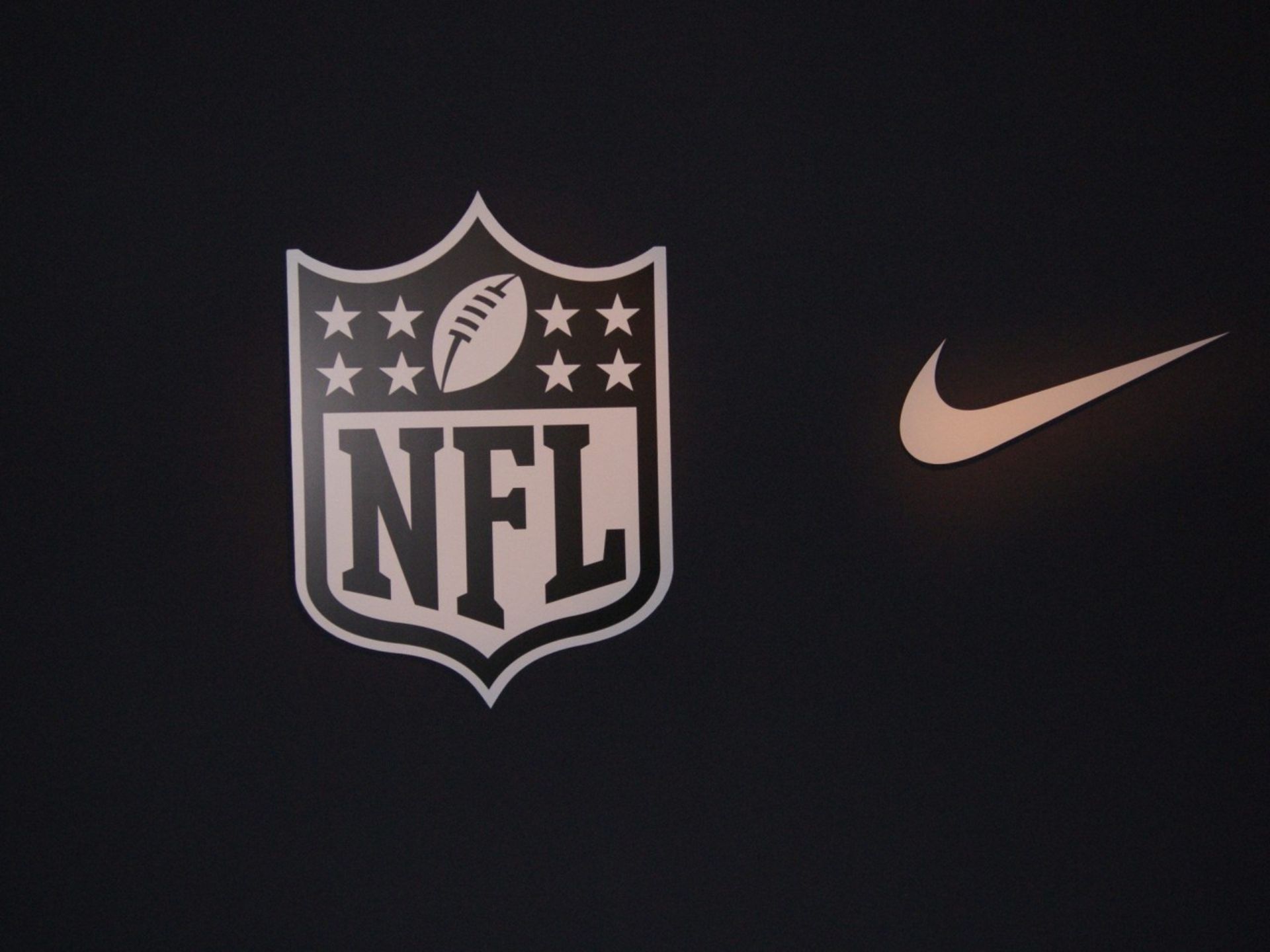 Description: A nike logo and a nfl logo on a wall at night with a glow on it's side.