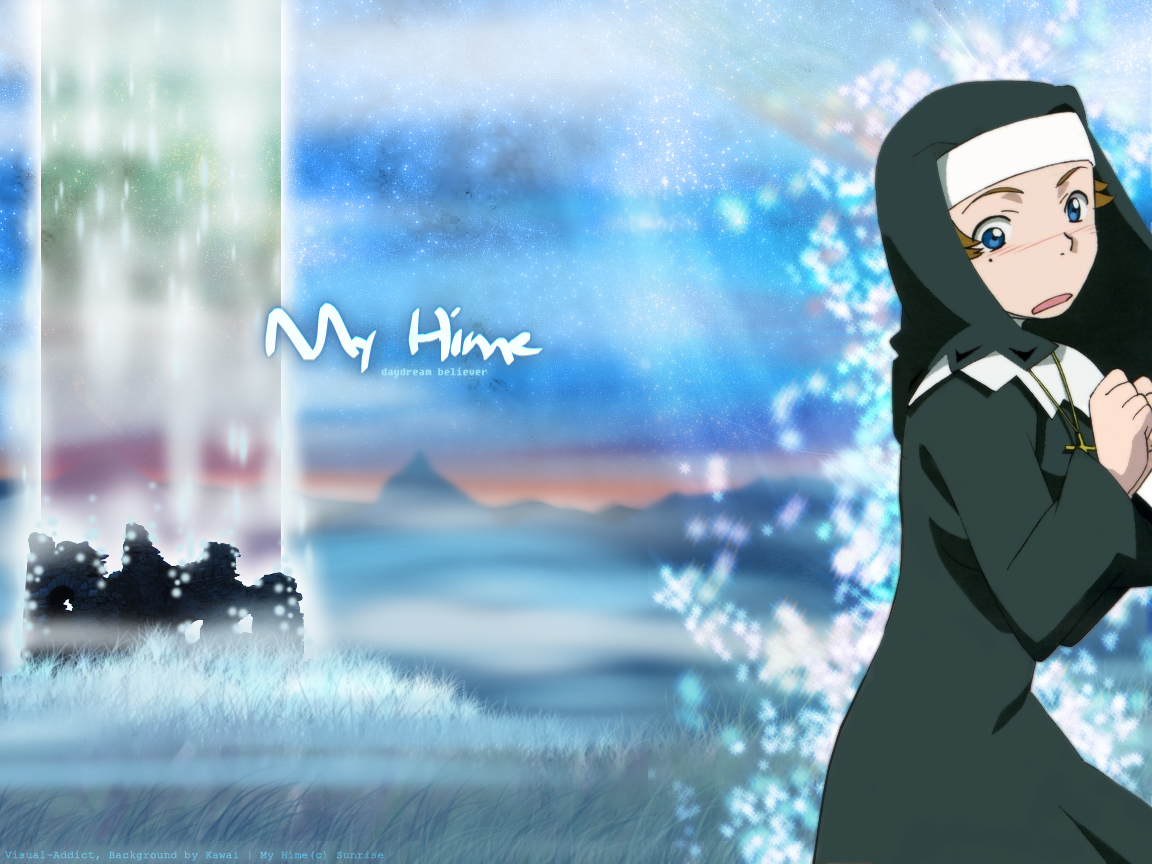 Description: A woman in a nun outfit standing in front of a waterfall with a sky background and a building in the background.