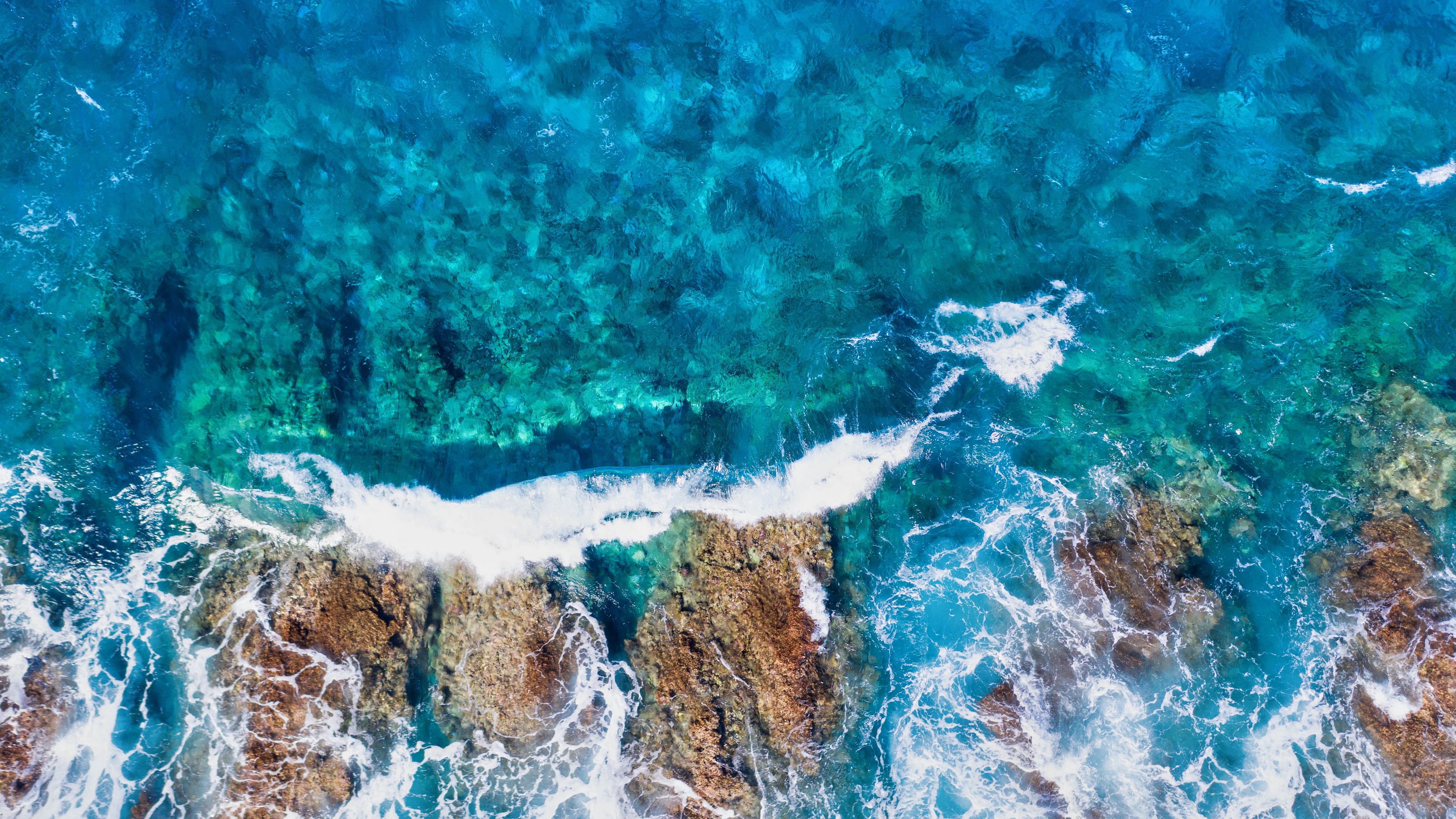 Description: A view of the ocean from above of a rocky cliff face and ocean waves crashing on the rocks and the water.