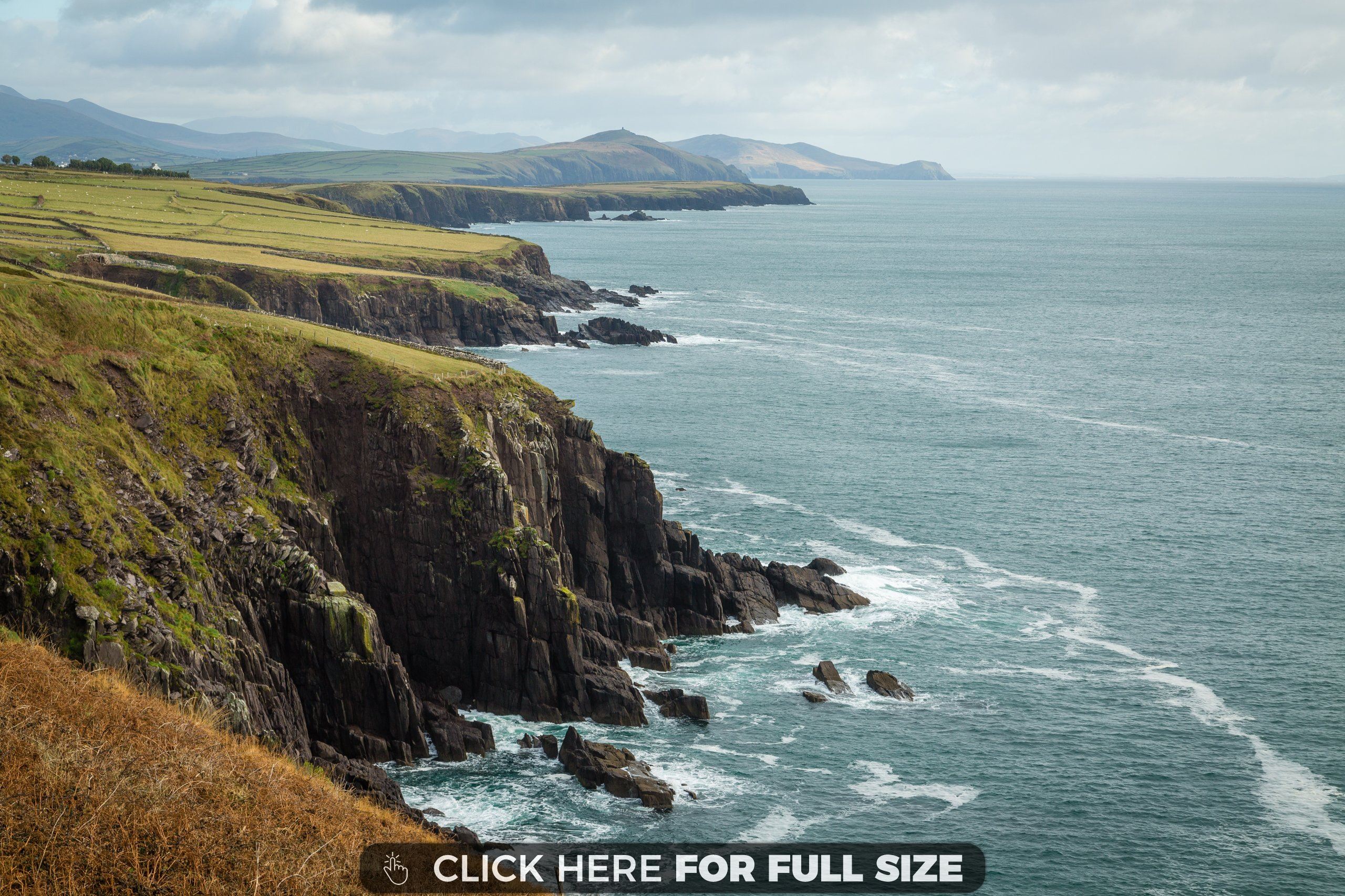 Description: A scenic view of the ocean and cliffs of a cliff side with a sign that says click here for full size.