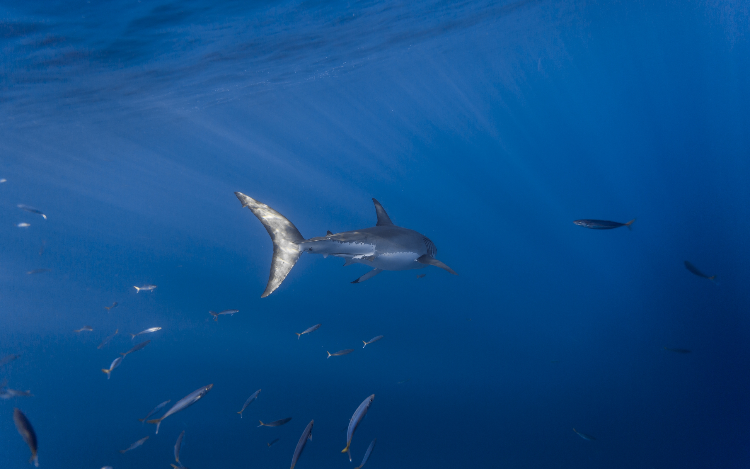 Description: A large group of fish swimming in the ocean together.