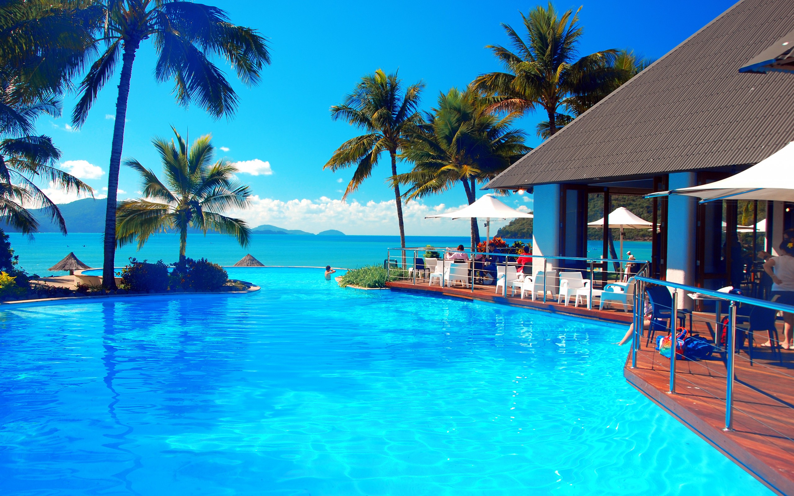 Description: A large swimming pool with a view of the ocean and palm trees in the background.