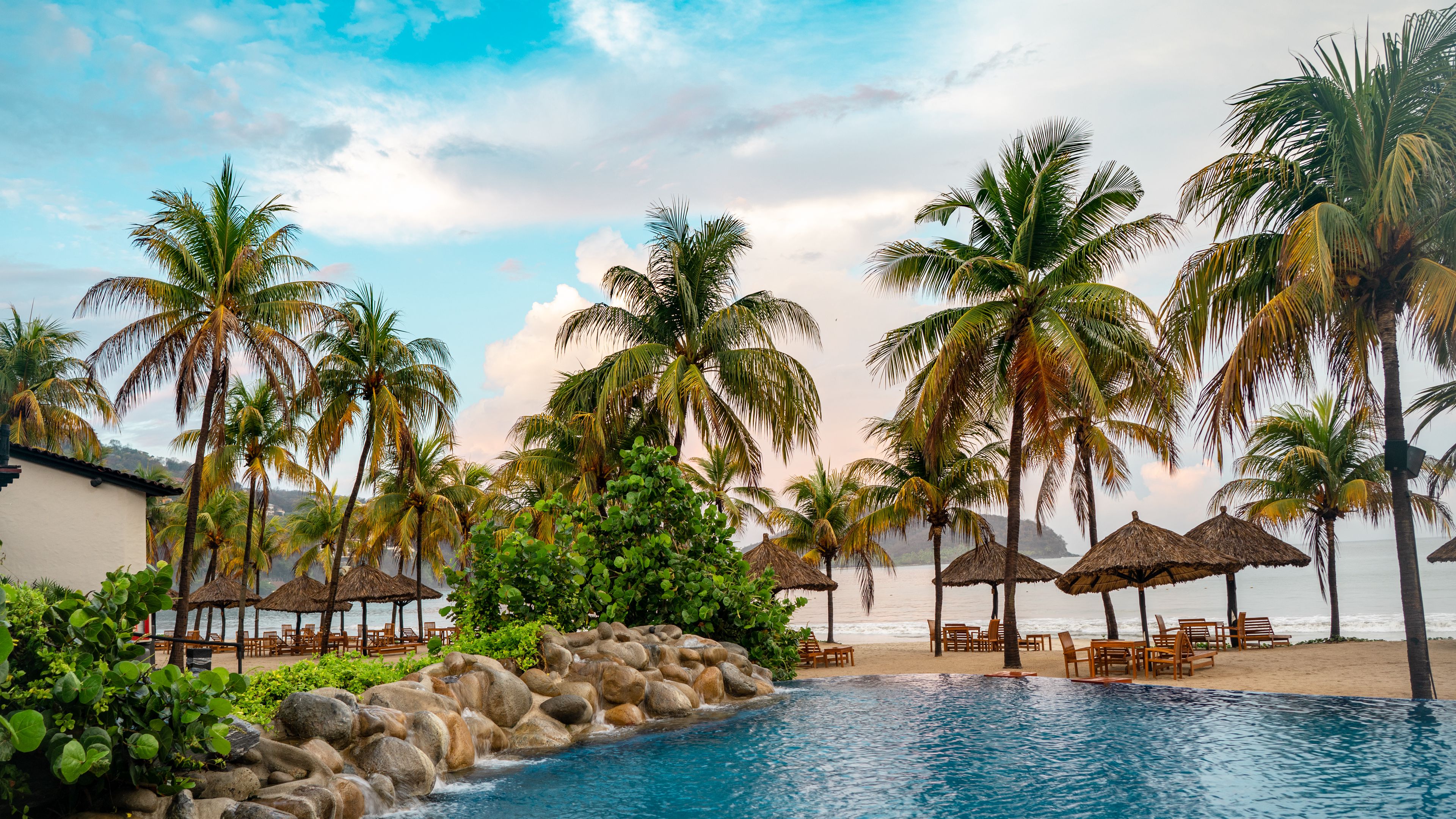 Description: A pool with a view of the ocean and palm trees in the background with chairs and umbrellas on the beach.