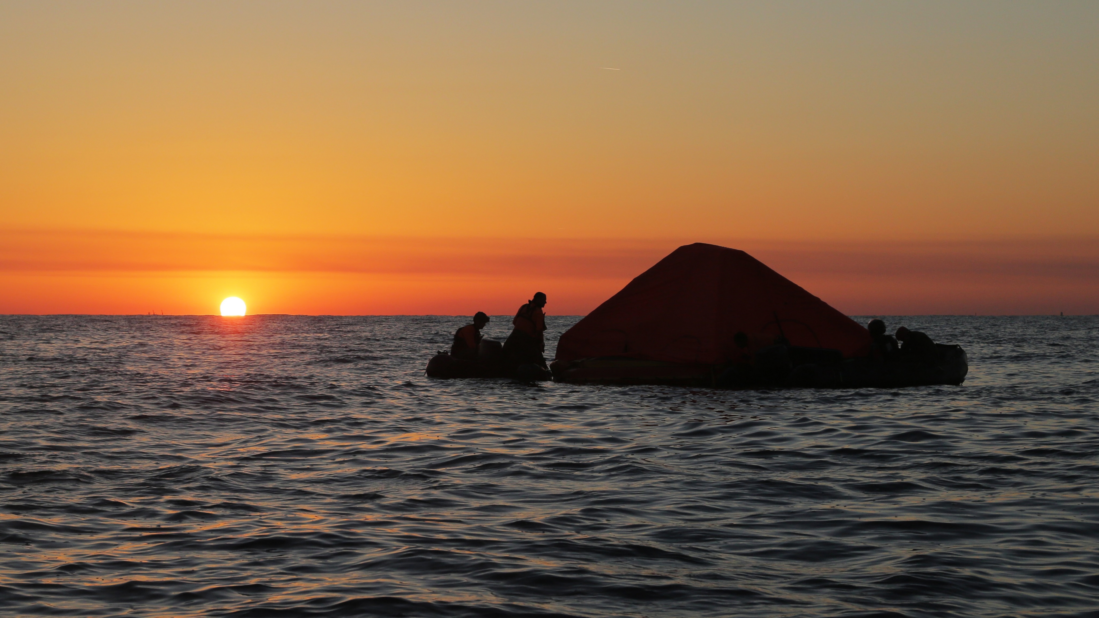Description: A group of people on a raft in the ocean at sunset or sunrise time with a tent in the water.