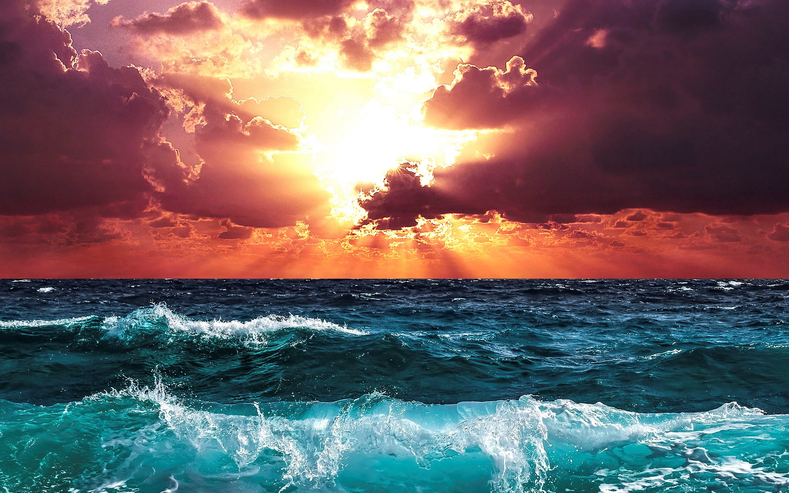 Description: A large body of water with a sky in the background and clouds above it with a sunbeam in the middle.