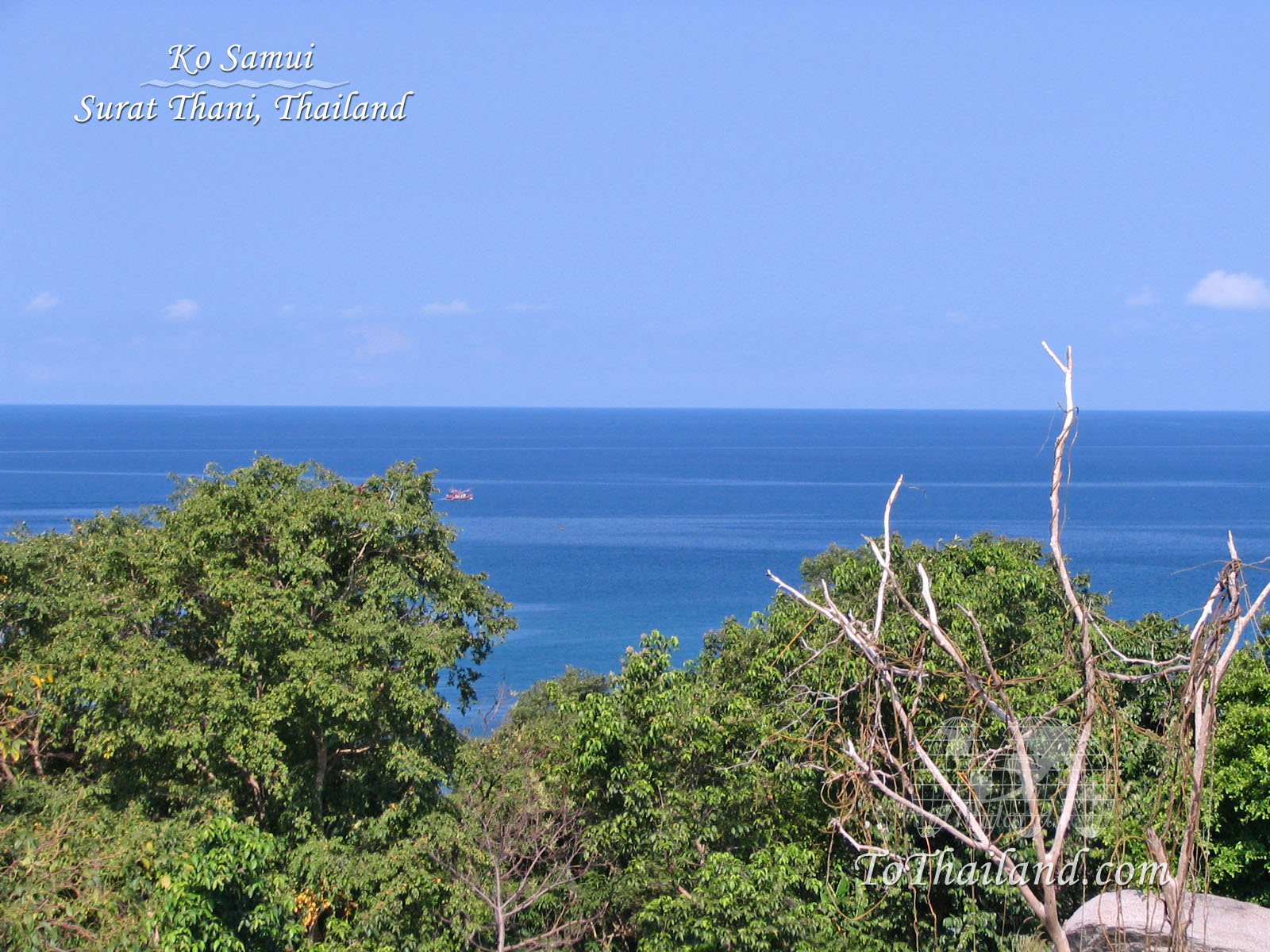 Description: A view of the ocean from a hill top with trees in the foreground and a boat in the distance.