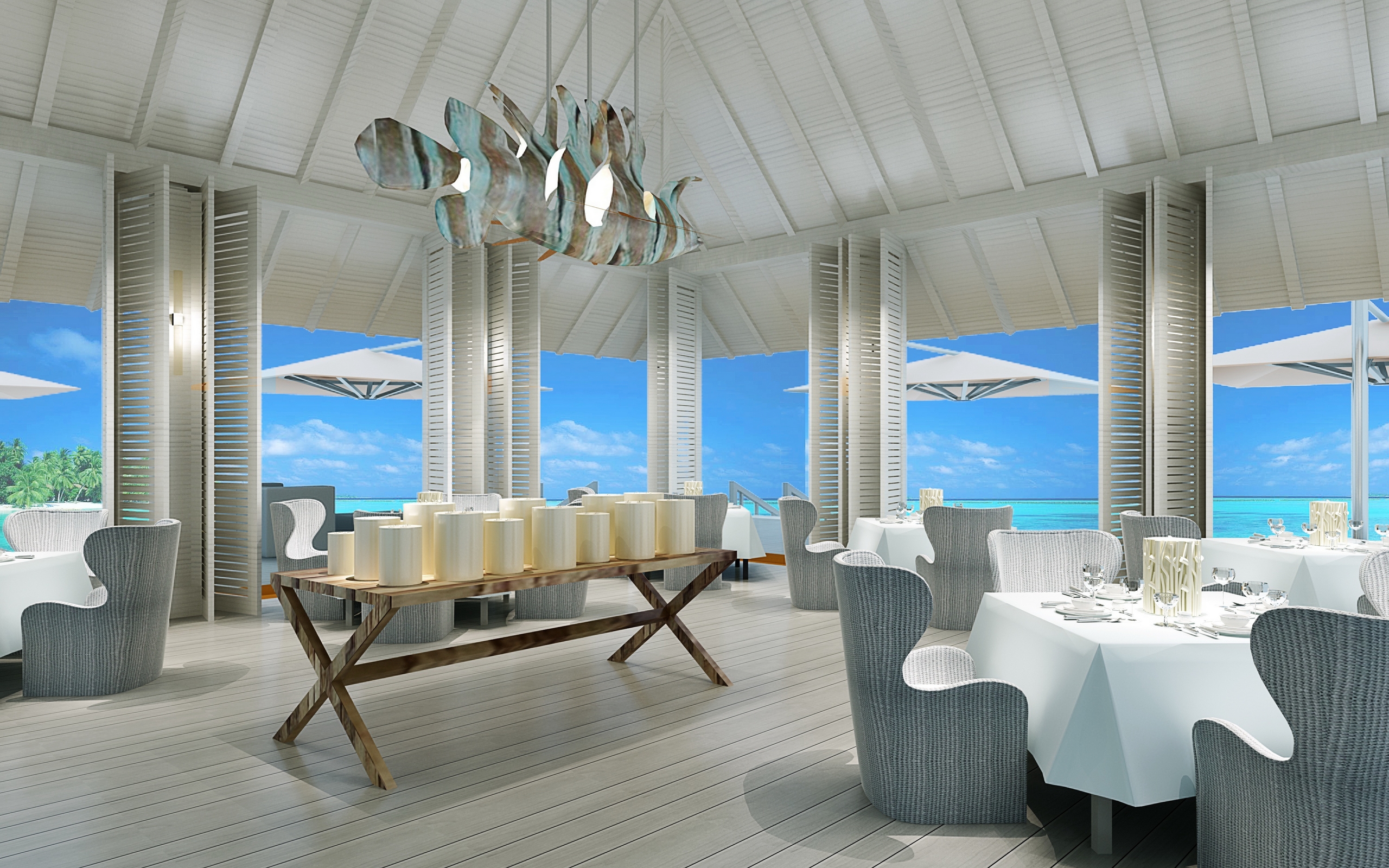 Description: A restaurant with a view of the ocean and the sky is empty of people or people.