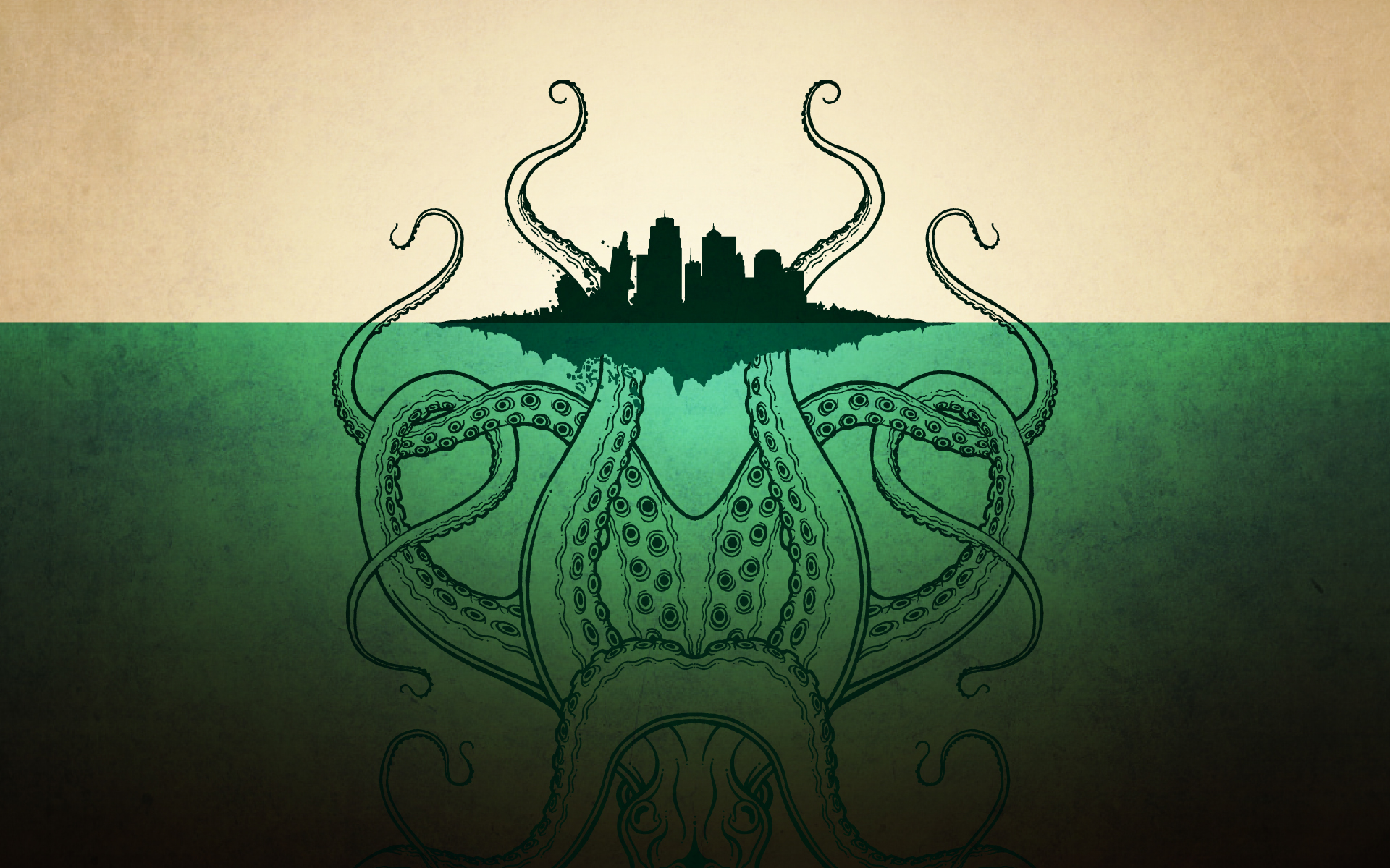 Description: An octopus is swimming in the water with a city in the background and a city in the water below.