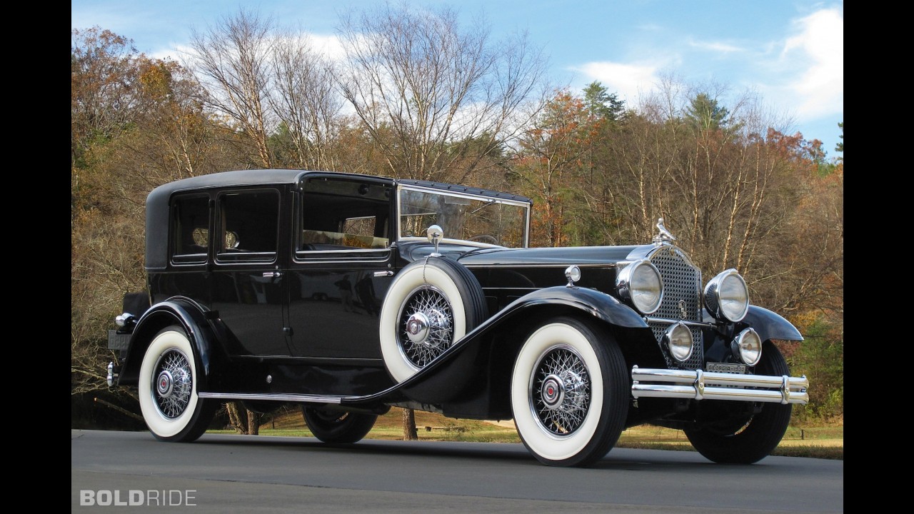 Description: An old black car is parked on the street in front of trees and bushes with a sky background and clouds.