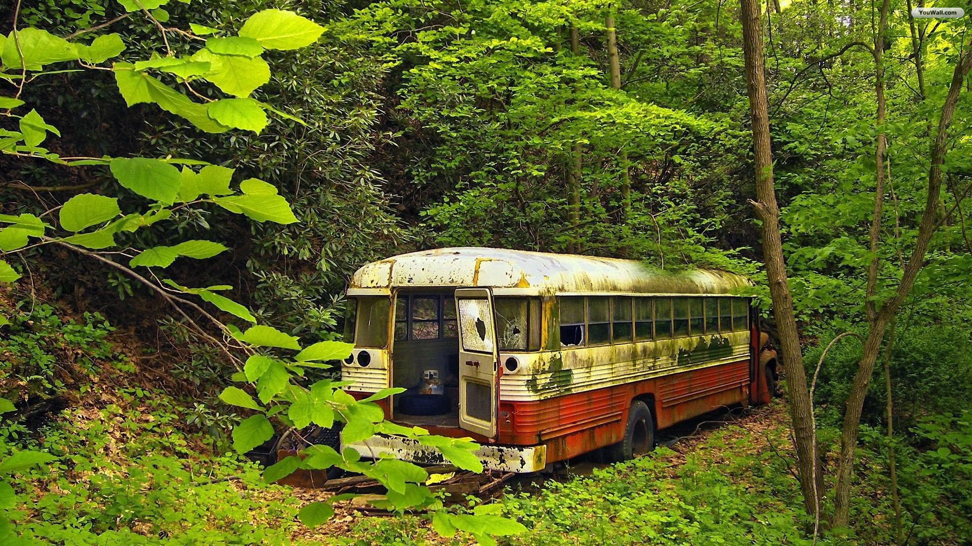 Description: An old bus is sitting in the middle of the woods.