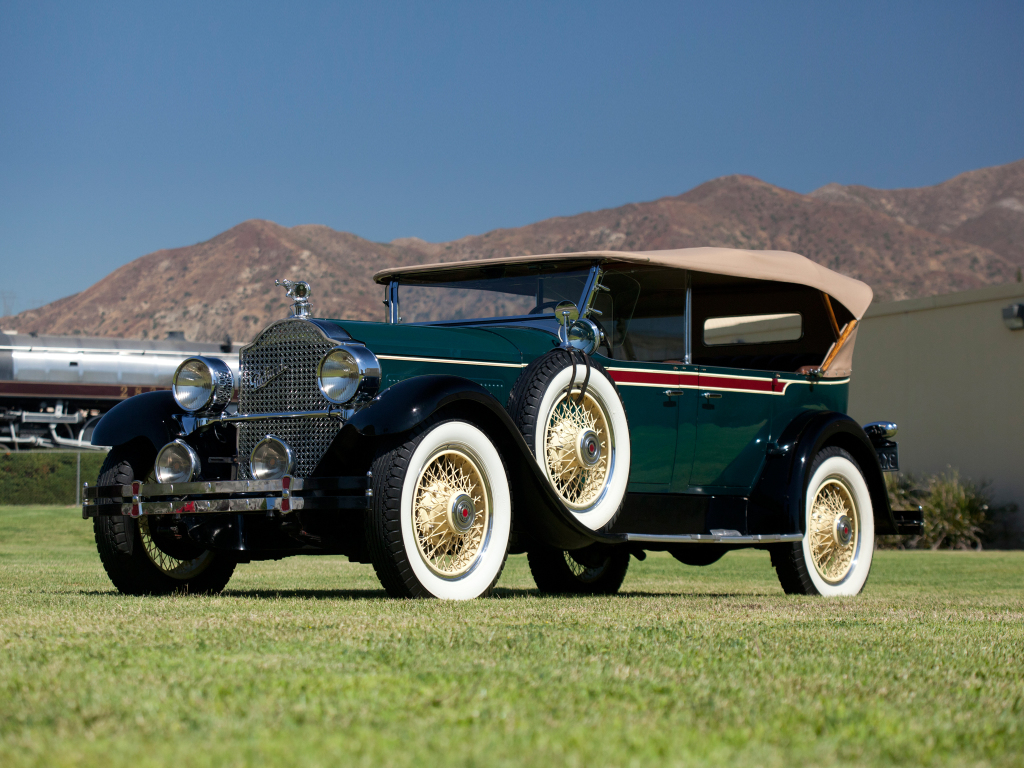 Description: An old model car parked in a field with mountains in the background and a building in the background with a plane in the background.