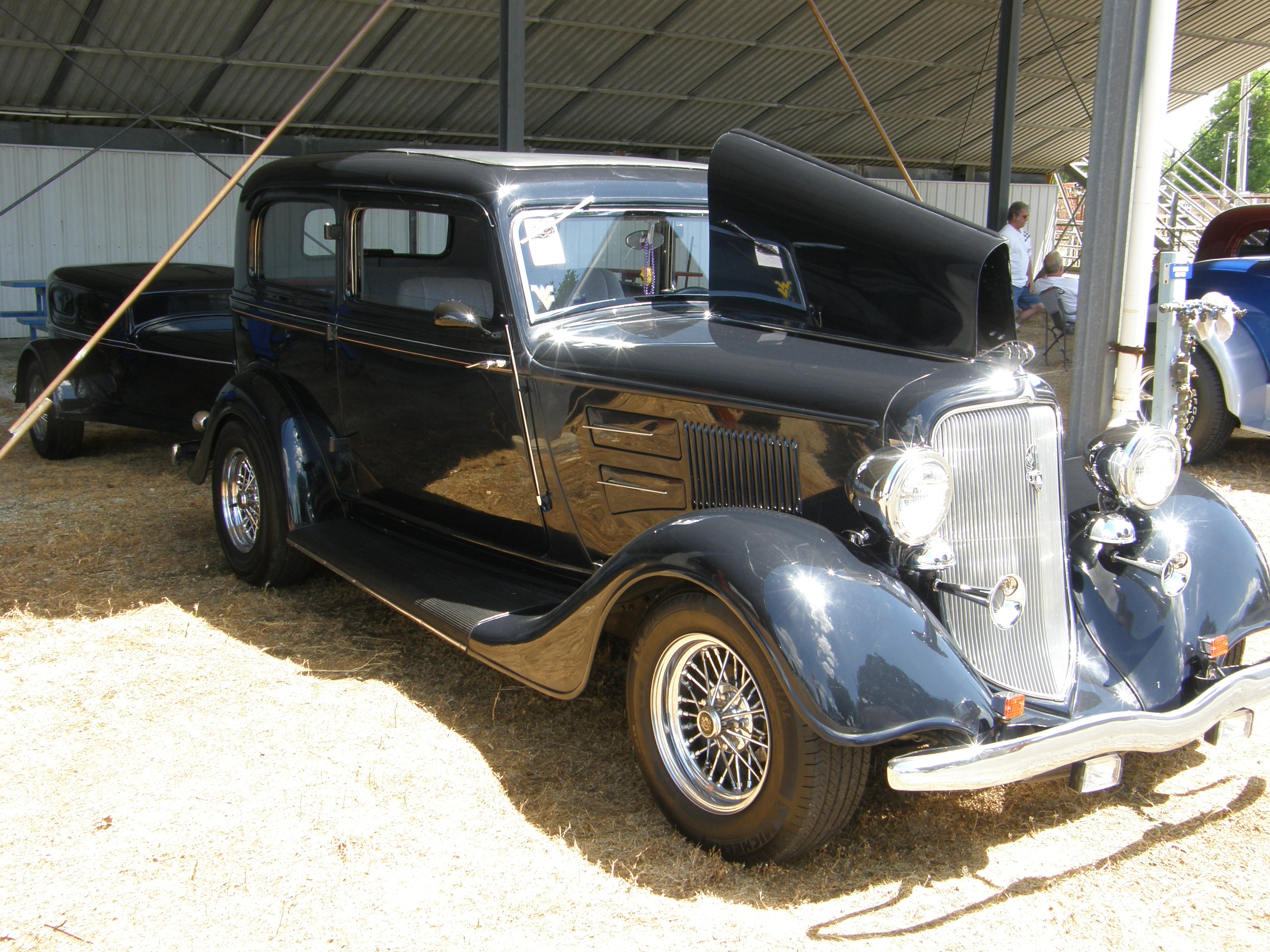 Description: An old car parked under a metal structure in a parking lot with other cars in the background and people standing around.
