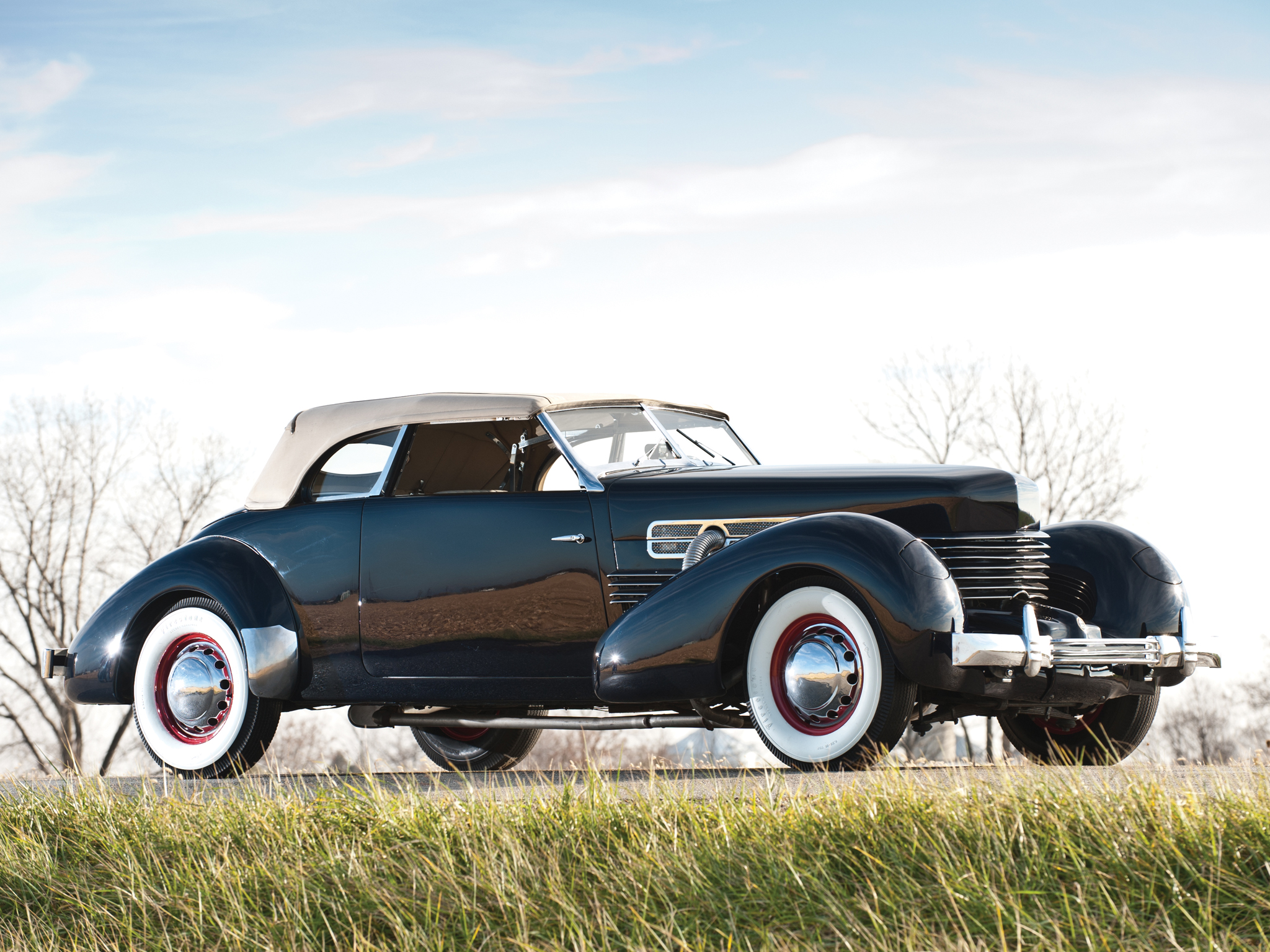 Description: An old car is parked on the side of the road in a field of grass and trees in the background.
