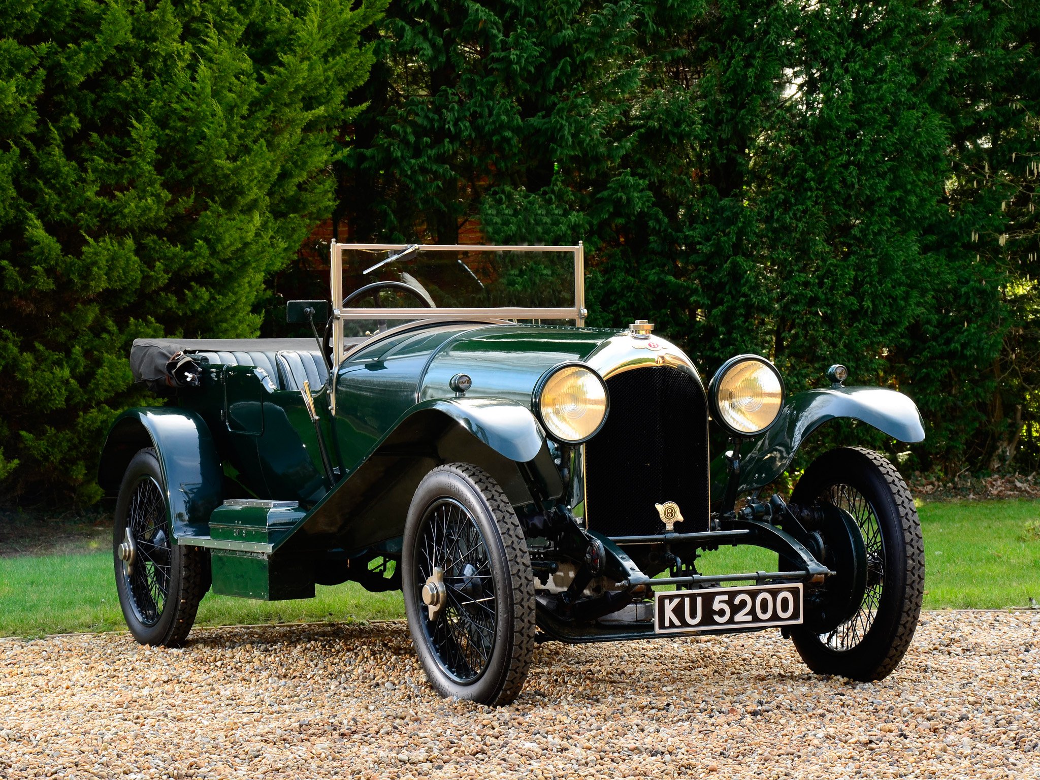 Description: An old model car parked on a gravel road in front of trees and bushes.