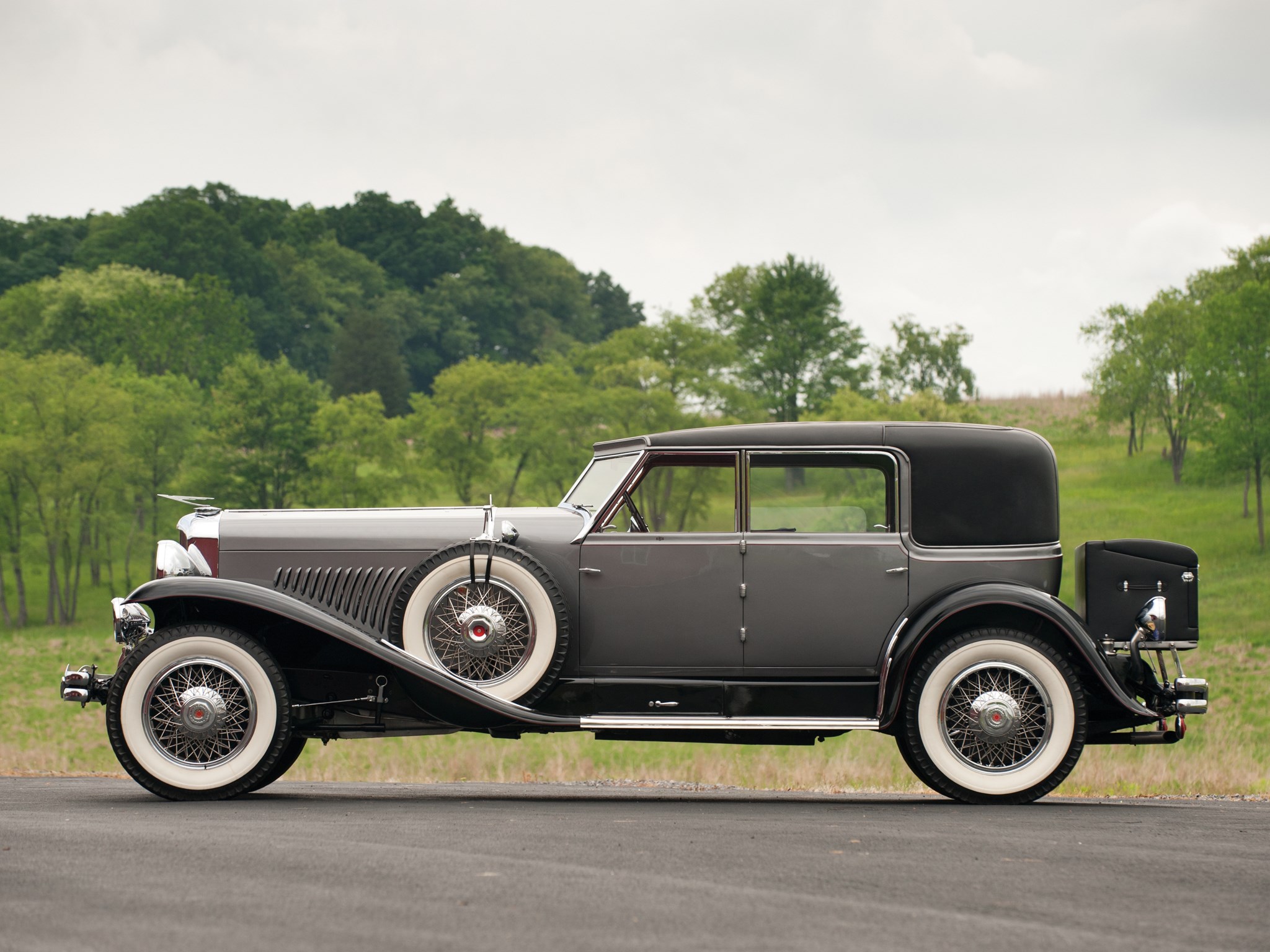 Description: An old model car is parked on the side of the road in front of a field and trees in the background.