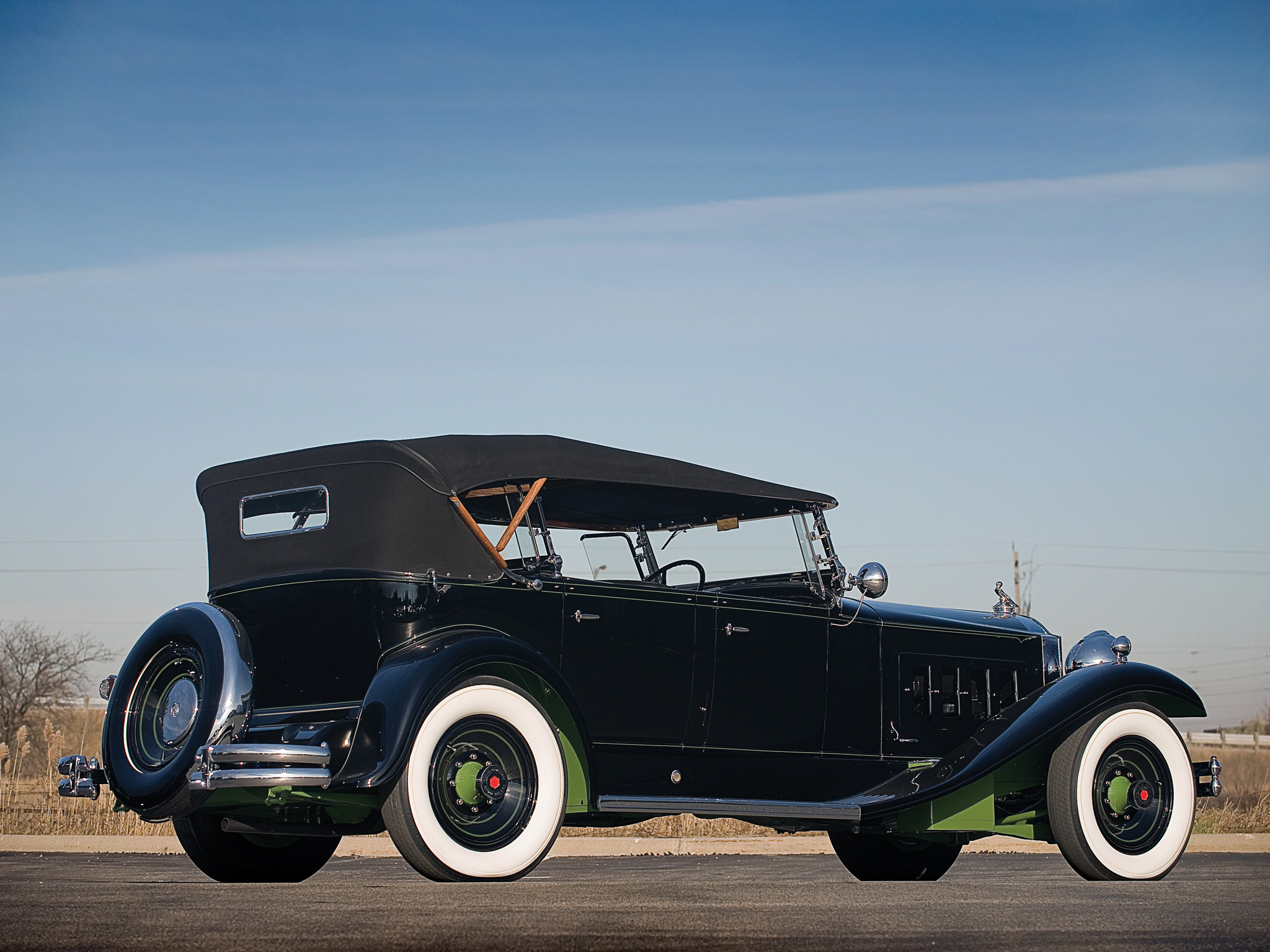 Description: An old model car is parked on the side of the road in a field of grass and trees.