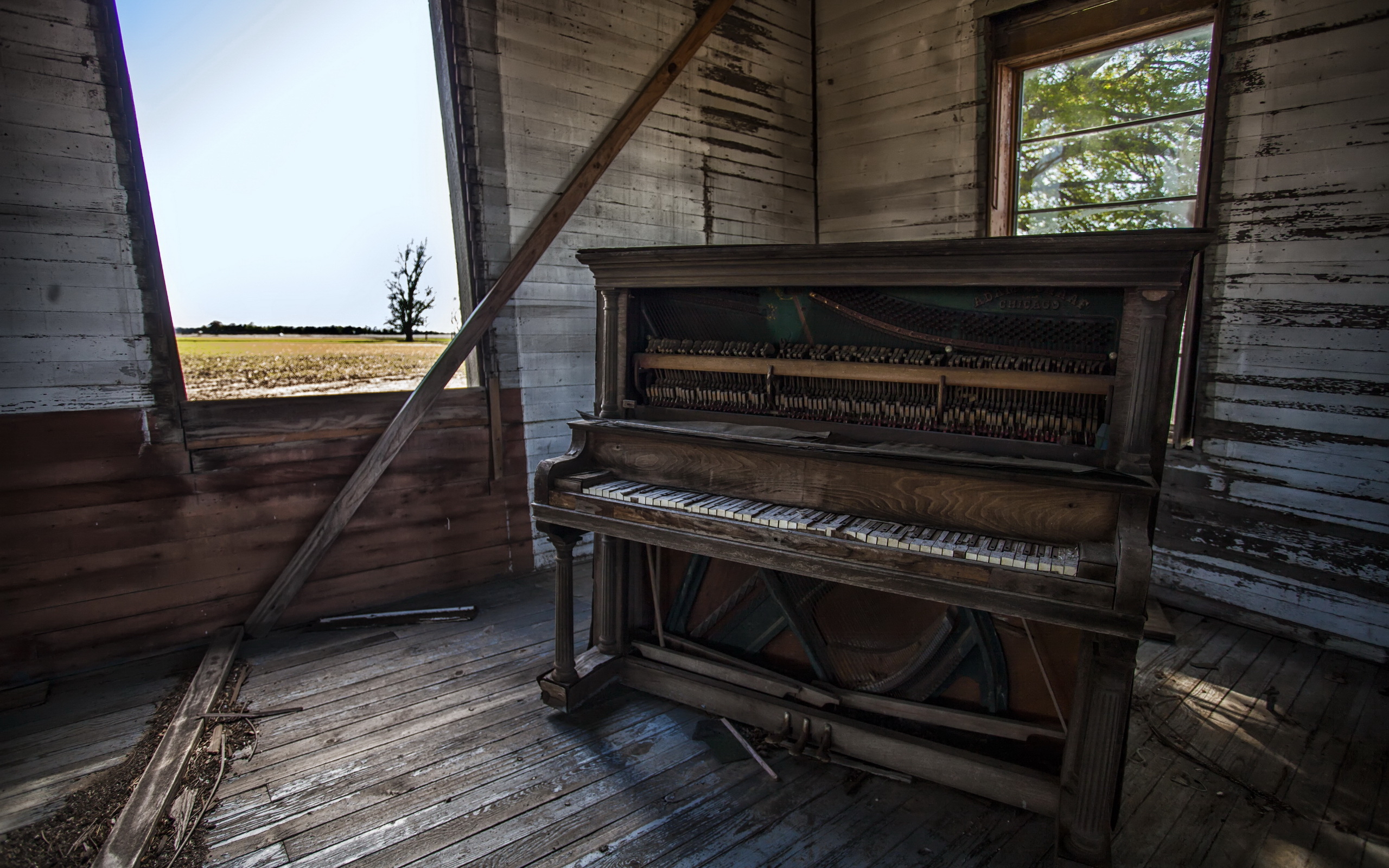 Description: An old piano sitting in a room with a window and a wooden floor and walls.