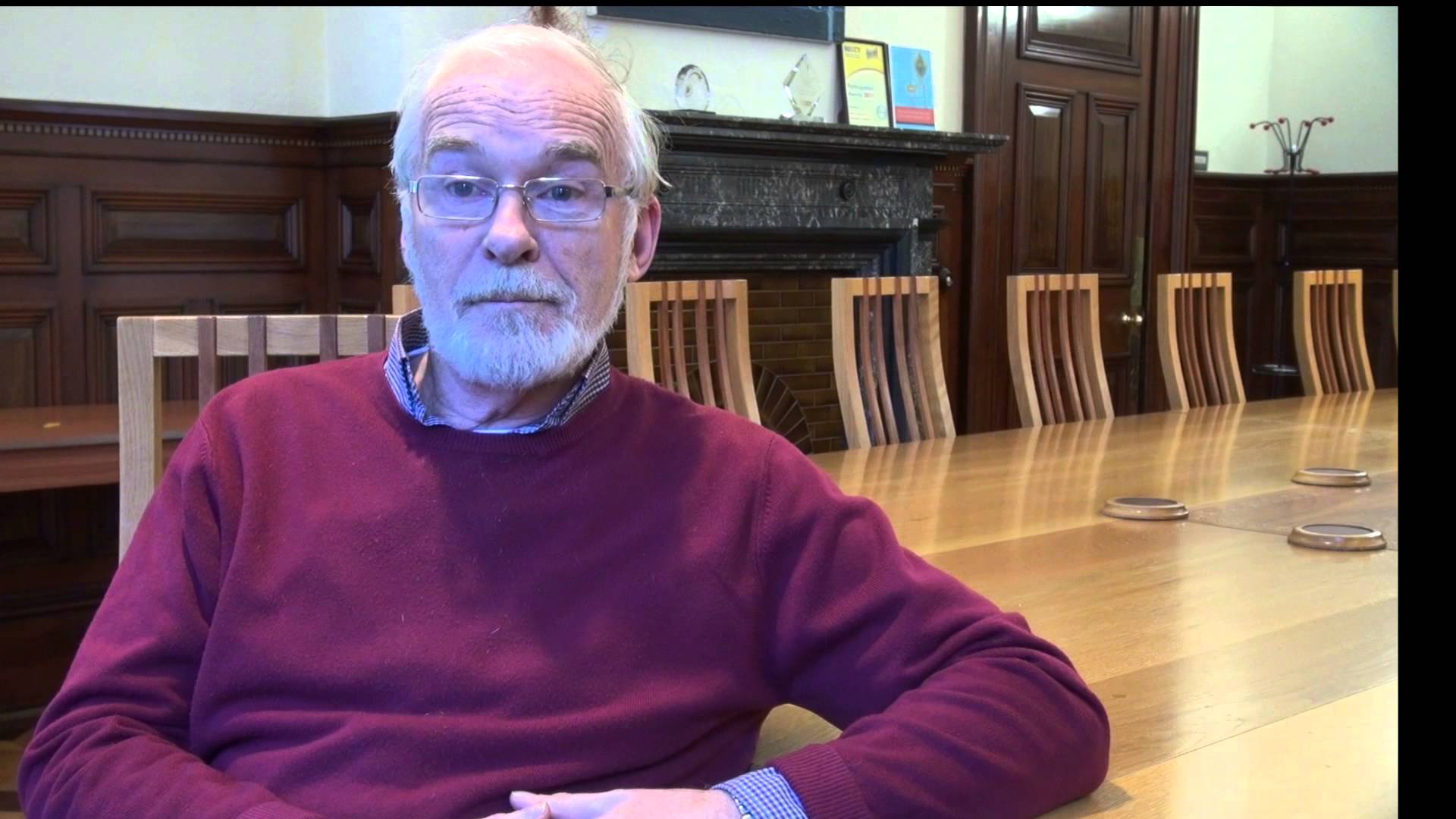 Description: An older man sitting at a table with a wine glass in front of him and a fireplace in the background.