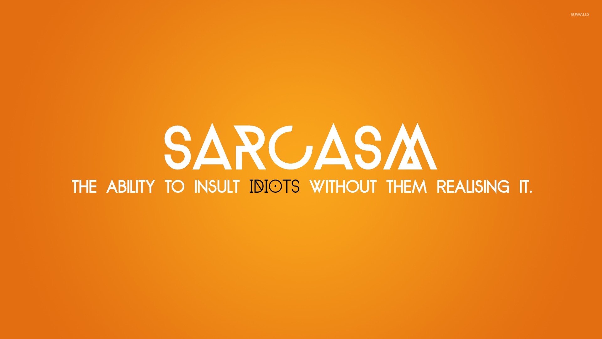 Description: A picture of a orange background with a white text that reads sarcasa the ability to insult idiots without them releasing it.