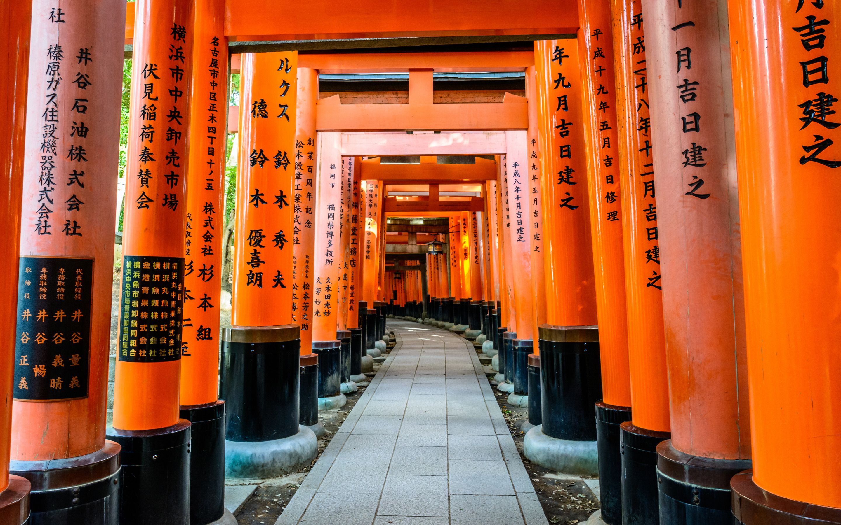 Description: A walkway lined with orange columns with asian writing on them and a walkway between them with black posts and black posts.