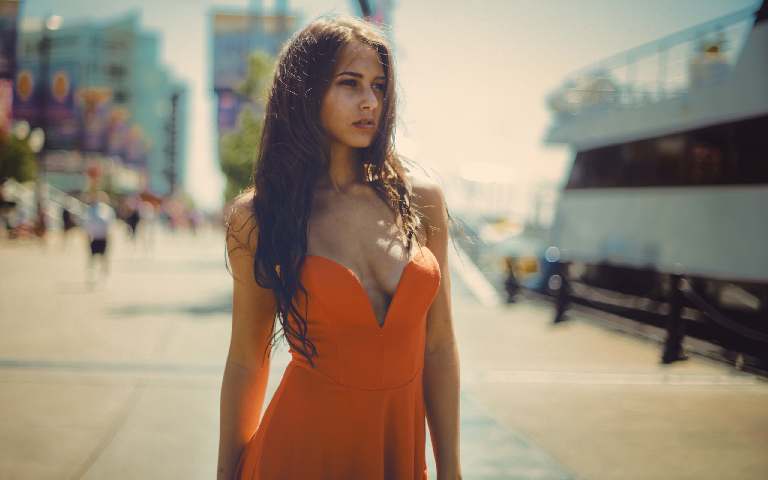 Description: A woman in an orange dress is standing on a sidewalk in a city with a bus in the background.