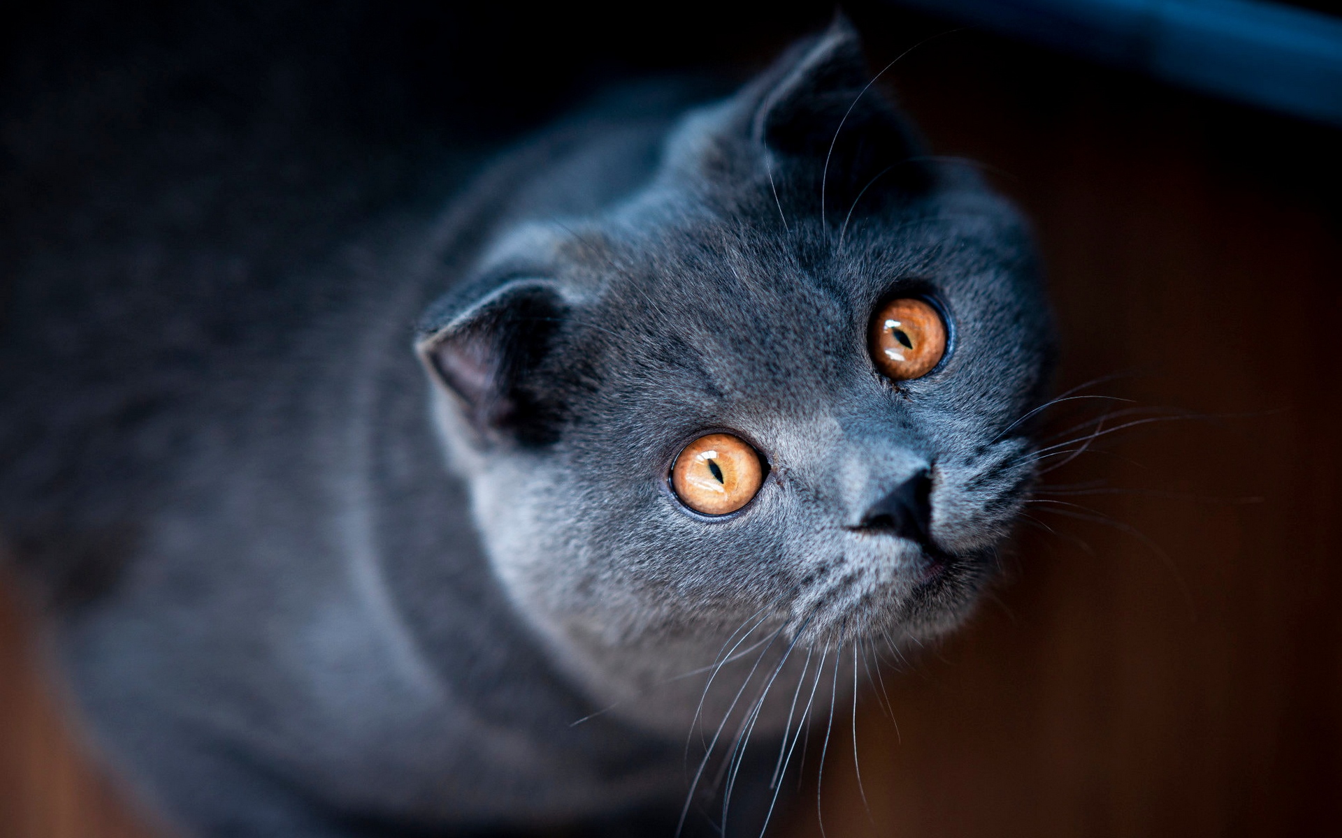 Description: A cat with orange eyes looking up at the camera with a blurry background of wood flooring and a wooden floor.