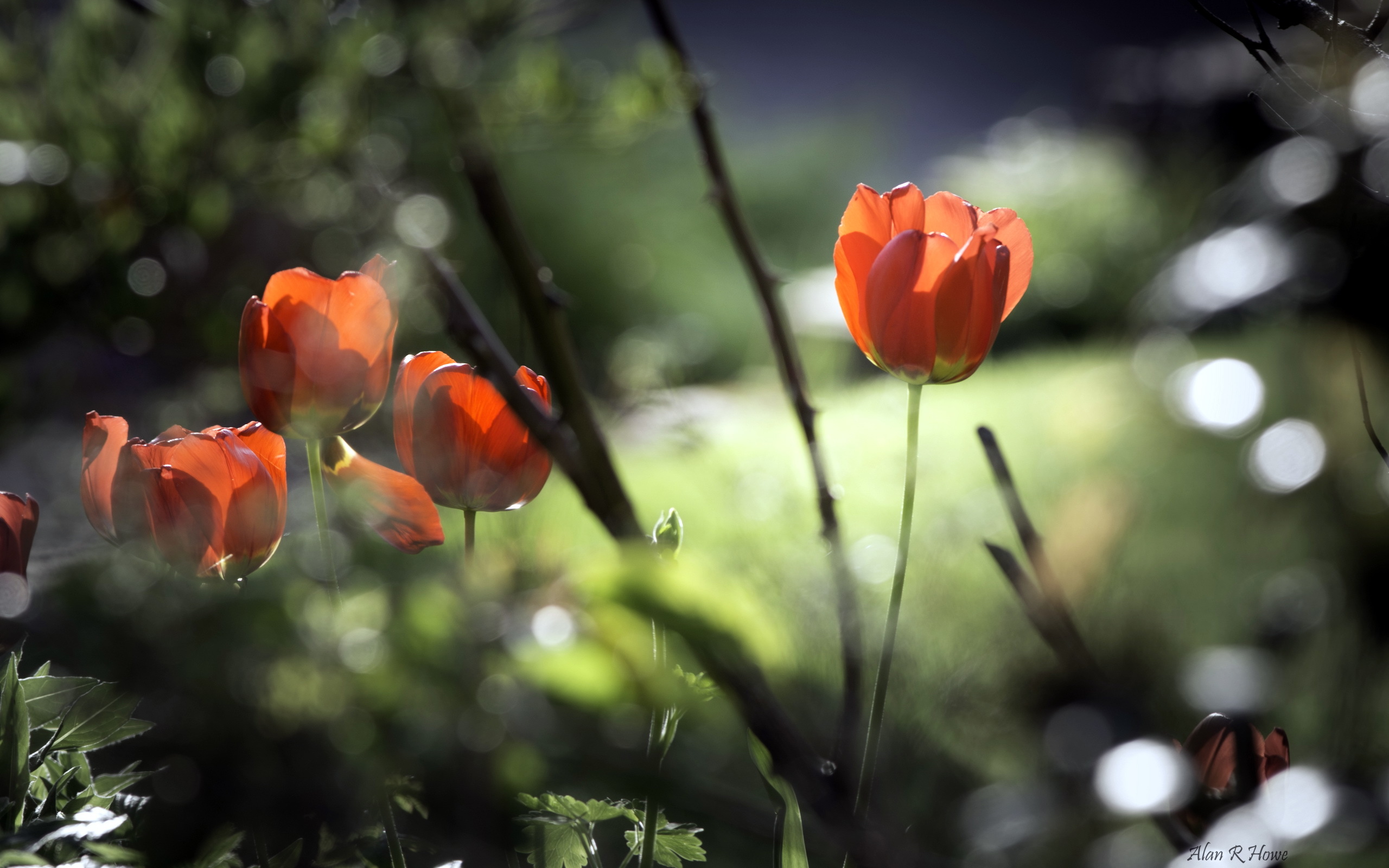 Description: A group of orange flowers in a field of grass and trees in the background.