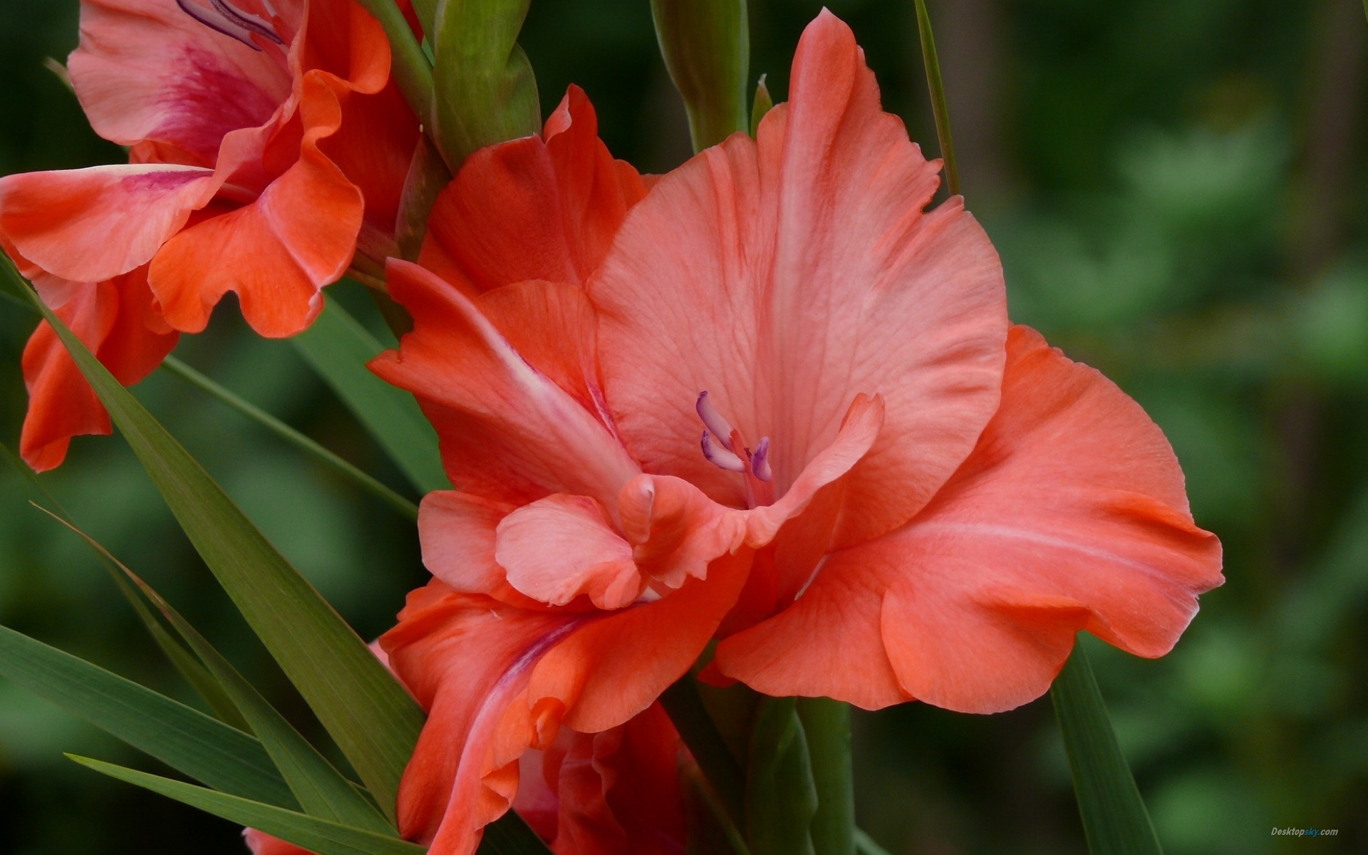 Description: A close up of two orange flowers with green leaves in the background and a blurry background behind them.