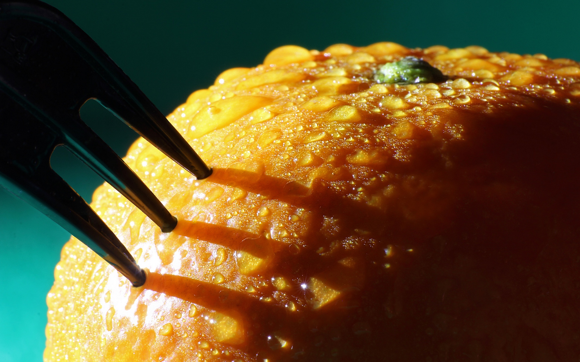 Description: A close up of a orange with a fork stuck in it's center and a green background behind it.