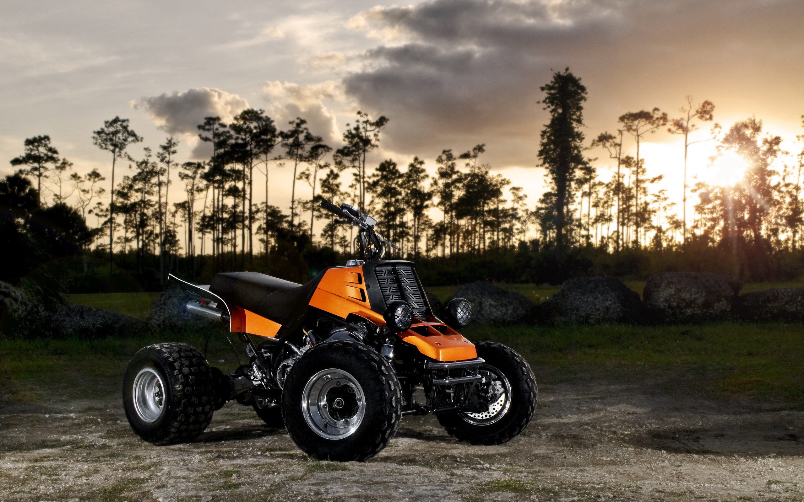 Description: A small orange four wheeler parked on a dirt road in front of a forest at sunset with clouds in the sky.