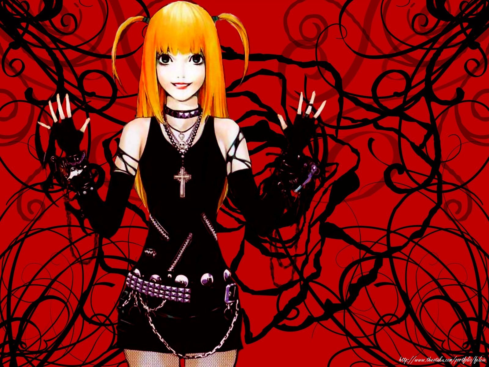 Description: A woman with orange hair and black clothes holding her hands up in the air with a red background behind her.