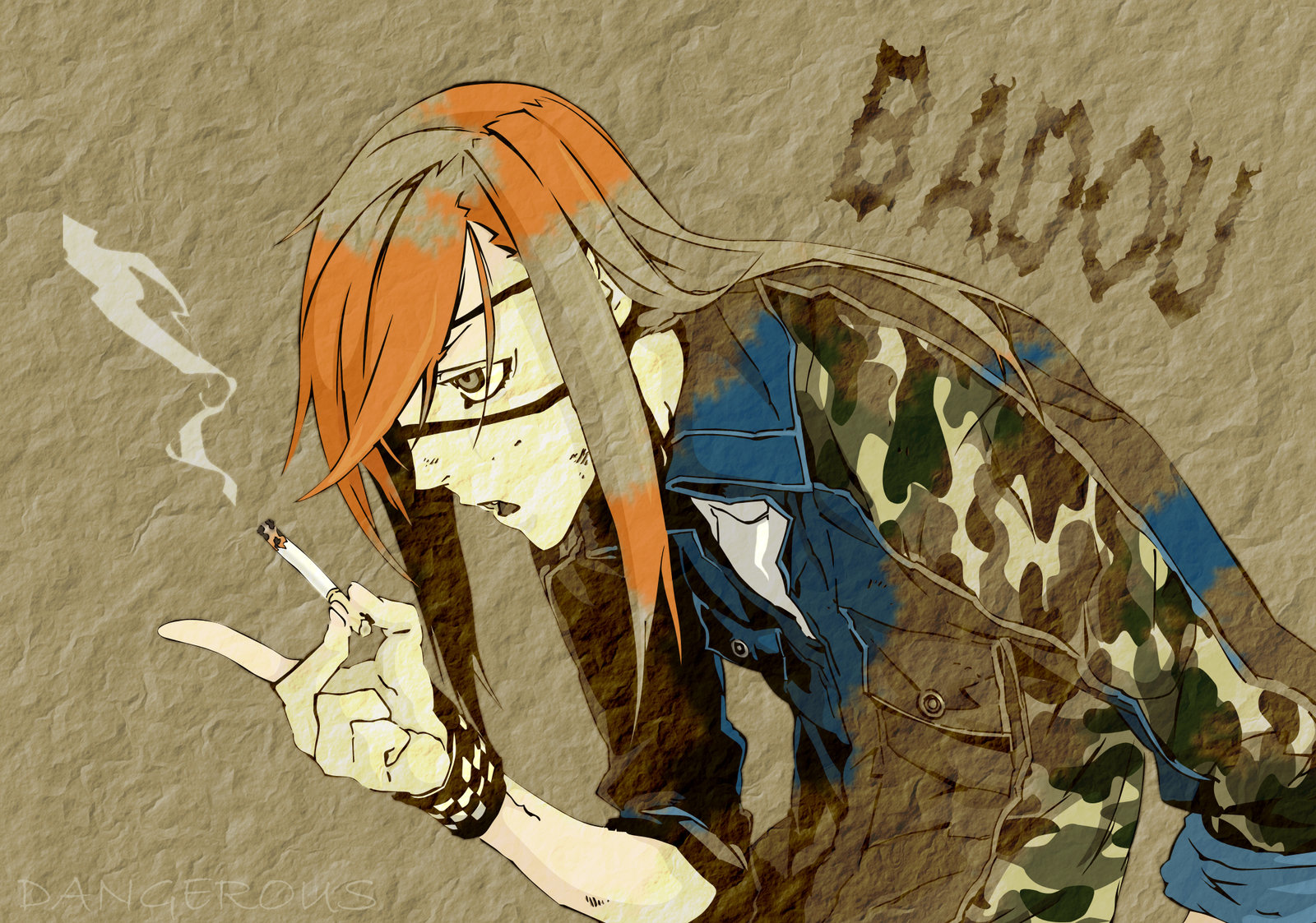 Description: A man with orange hair smoking a cigarette and looking at his phone while wearing a camouflage jacket and jeans.