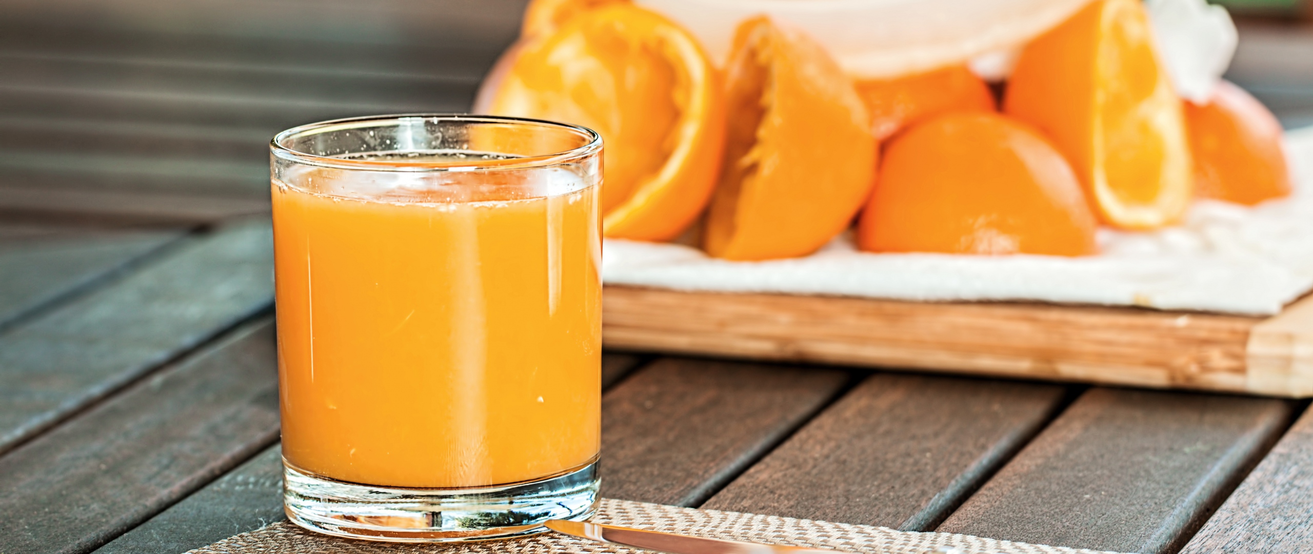 Description: A glass of orange juice on a wooden table with a cutting board and oranges in the background on a table.