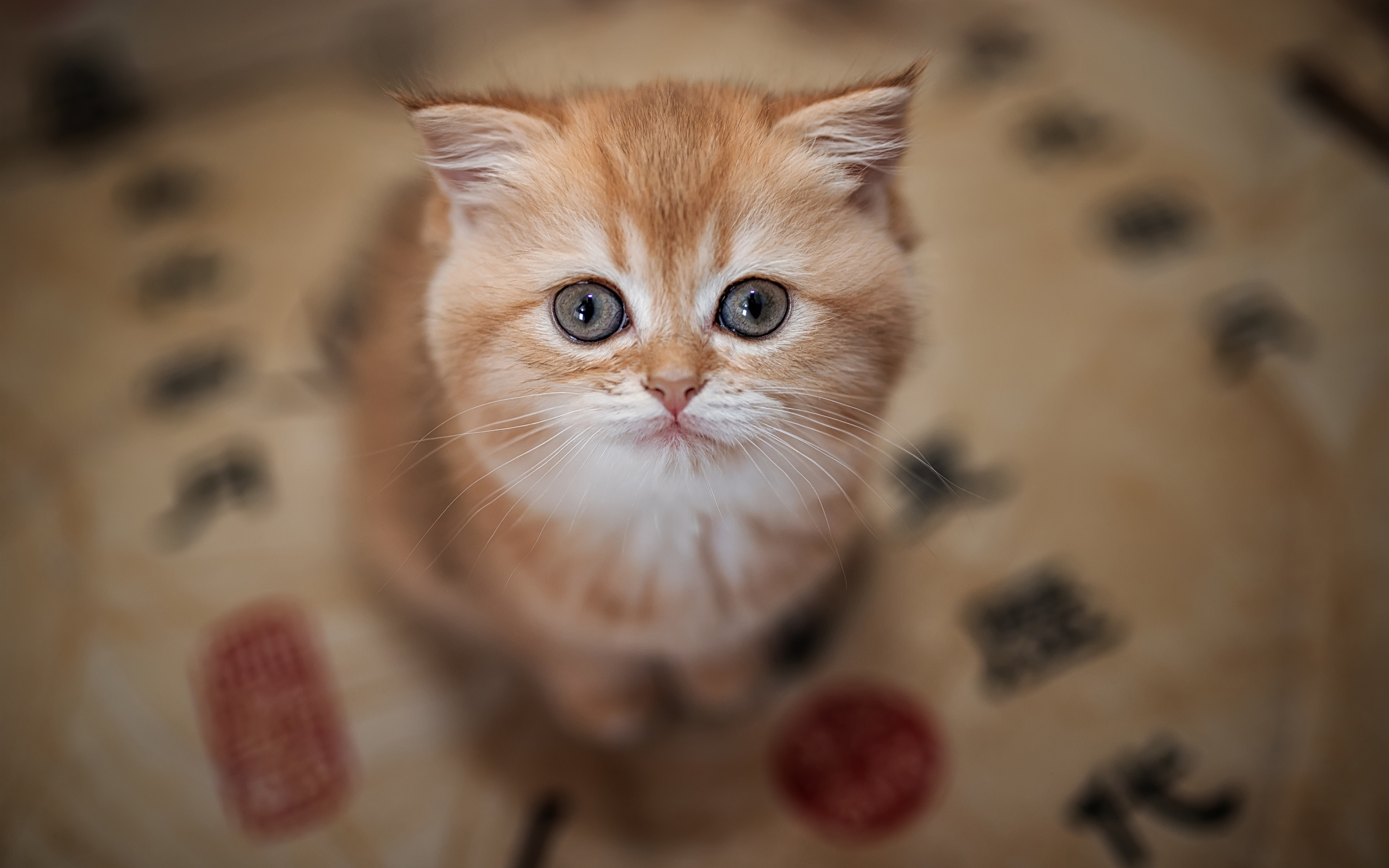 Description: A small orange kitten sitting on top of a table next to a red and white sign with chinese writing.