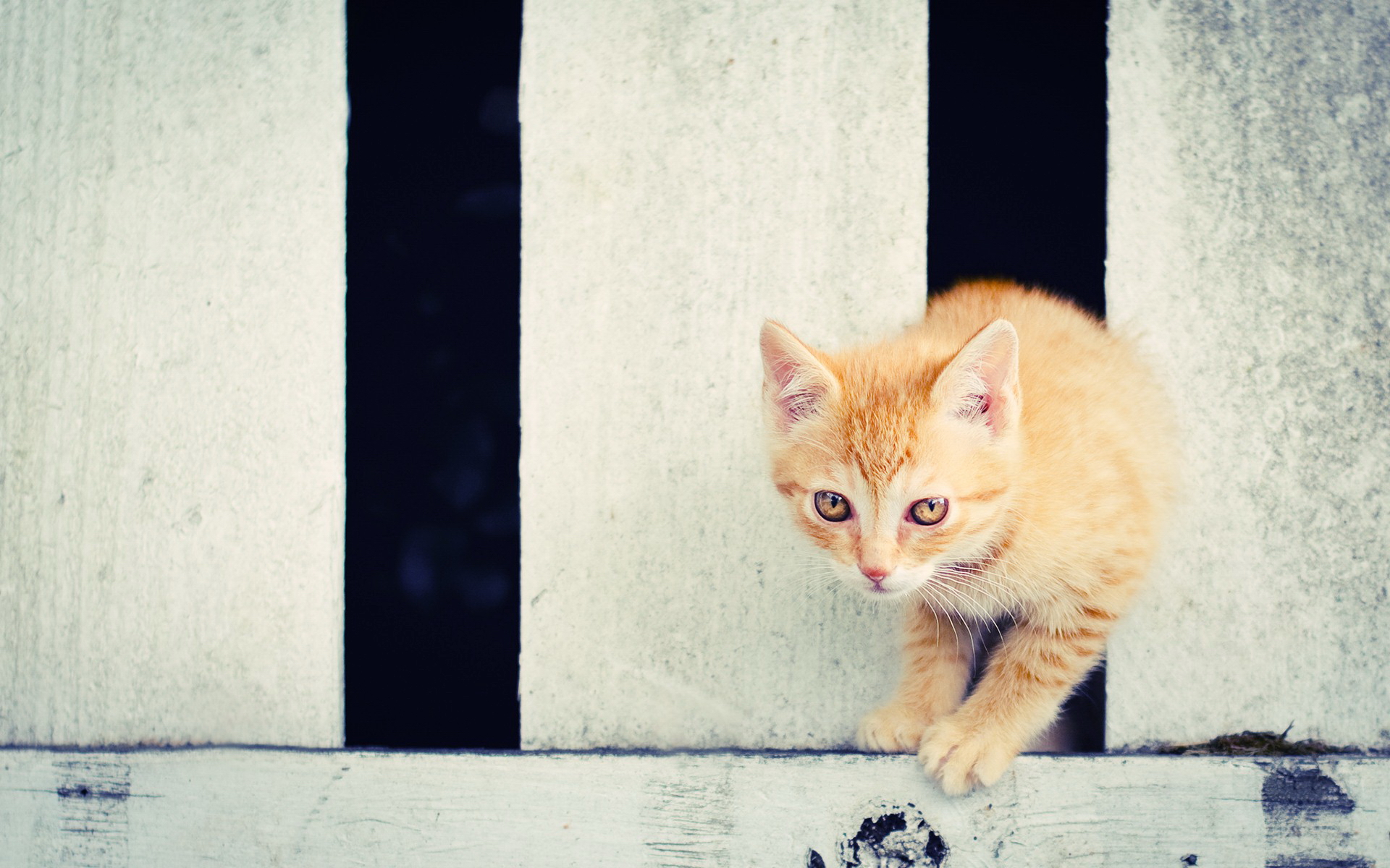Description: A small orange kitten walking on a ledge outside of a window with bars on it's sides and a paw on the window sill.