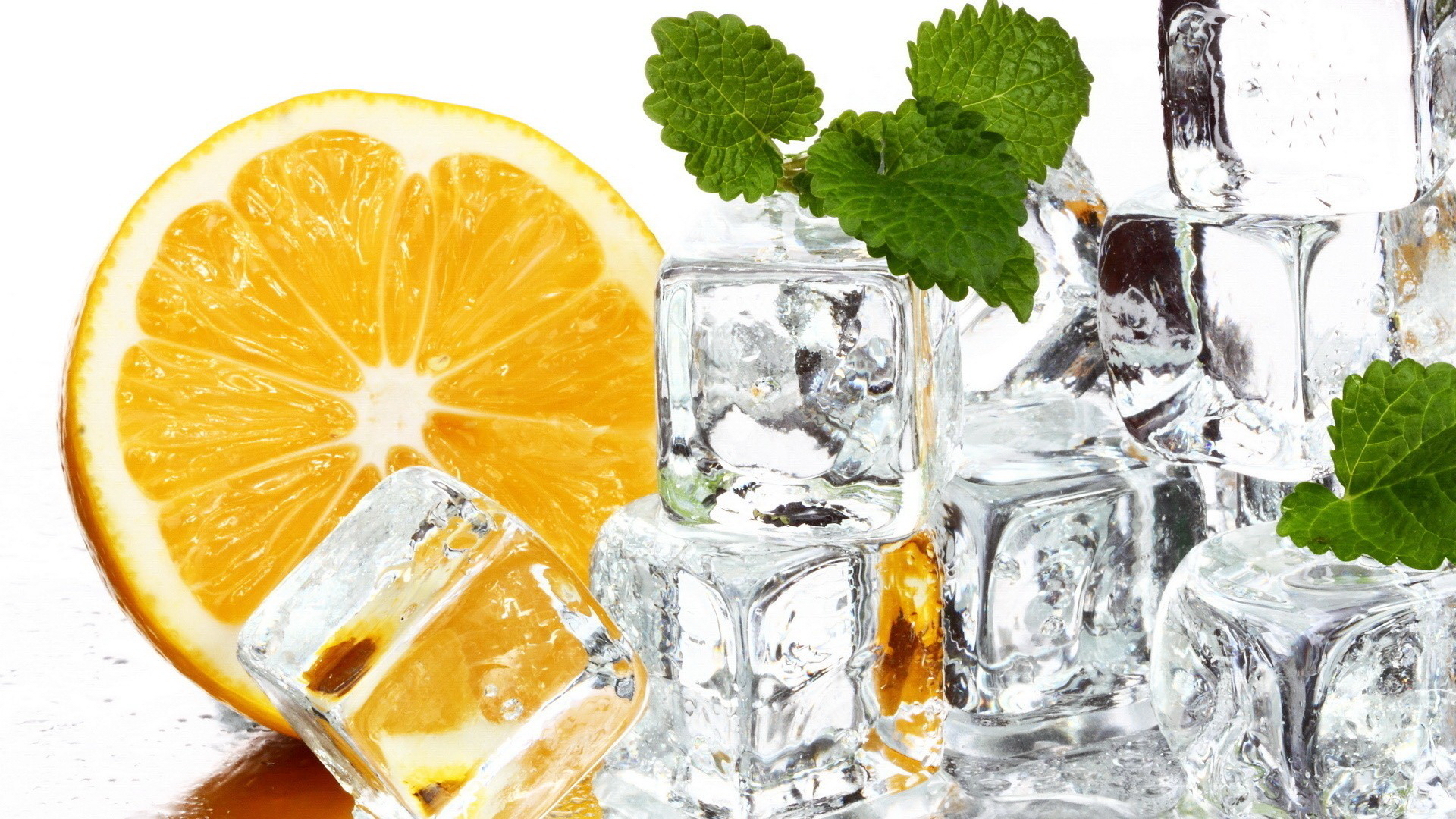 Description: A slice of orange sitting on top of ice cubes next to a mint leaf and a lemon slice.