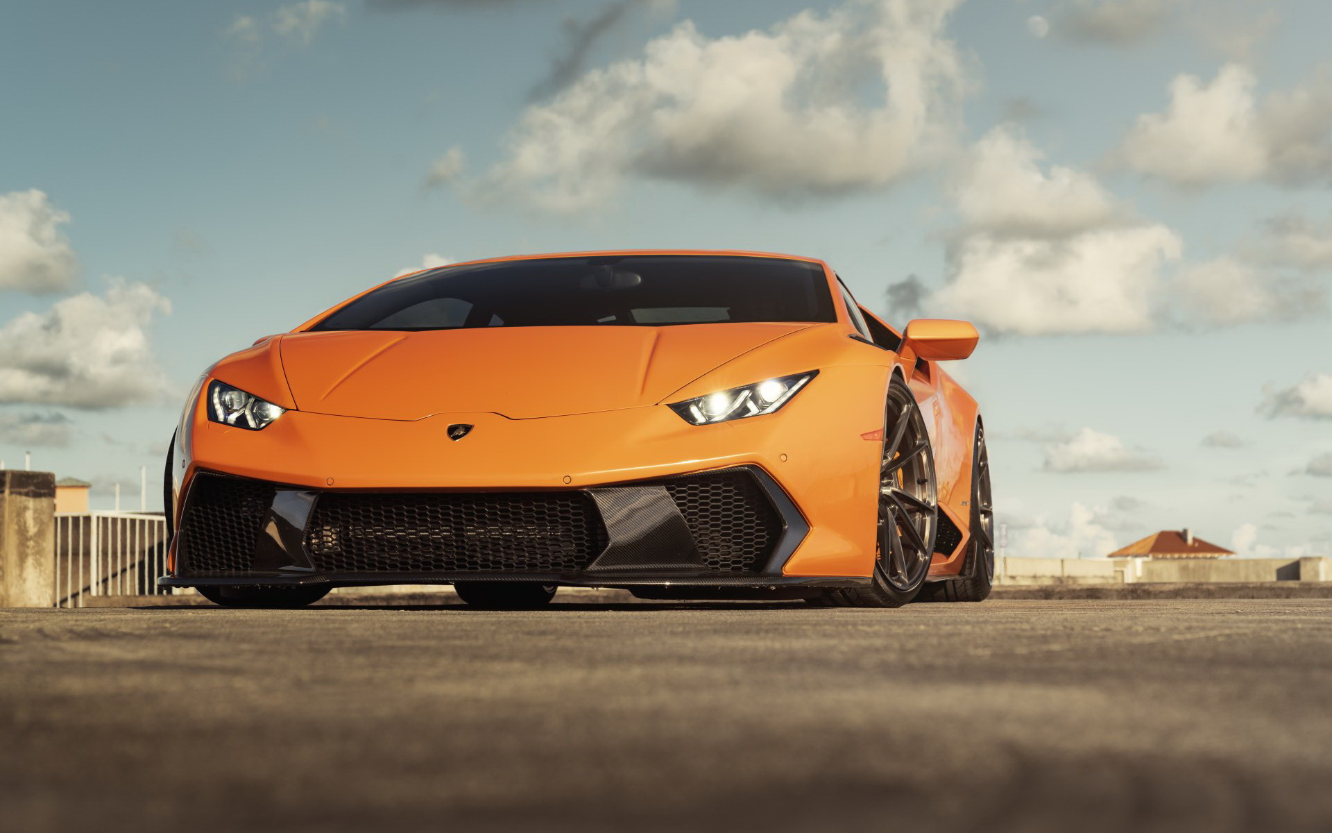 Description: A very nice looking orange sports car parked in a lot with clouds in the background and a blue sky.