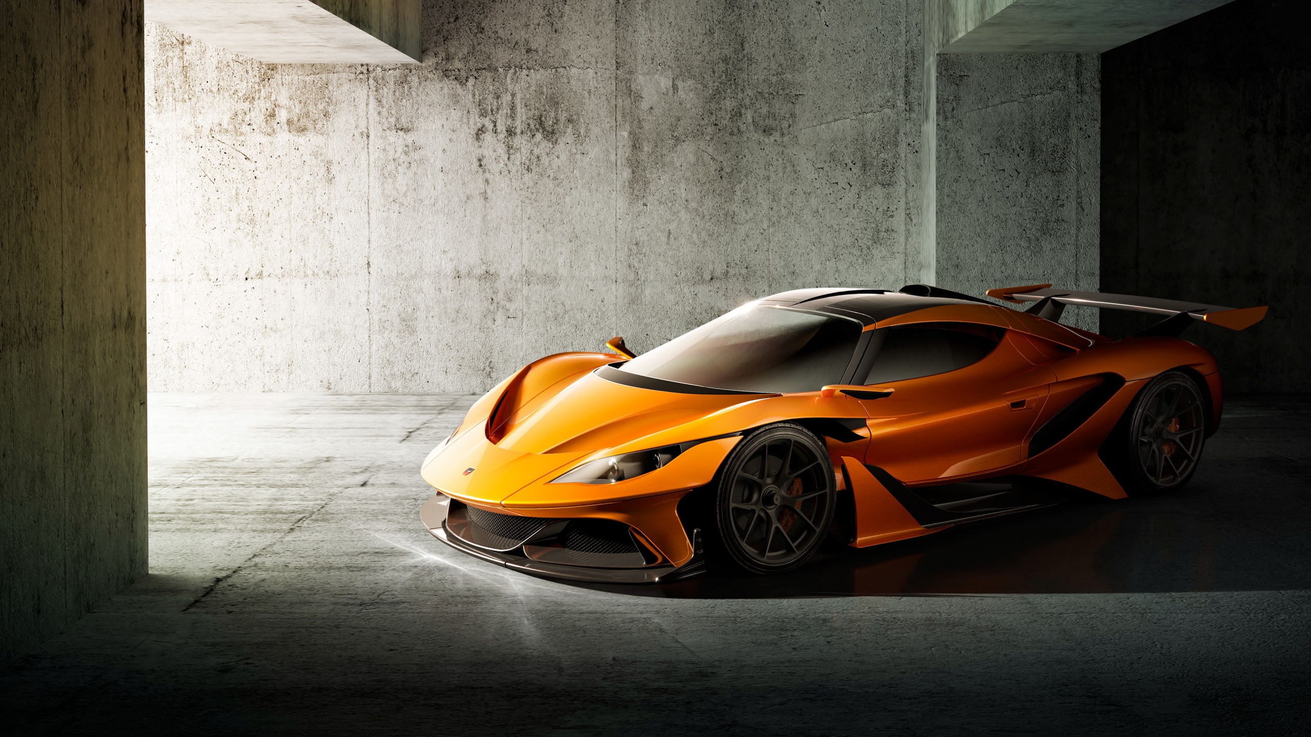 Description: A orange sports car parked in a dark room with concrete walls and flooring on the walls and floor.